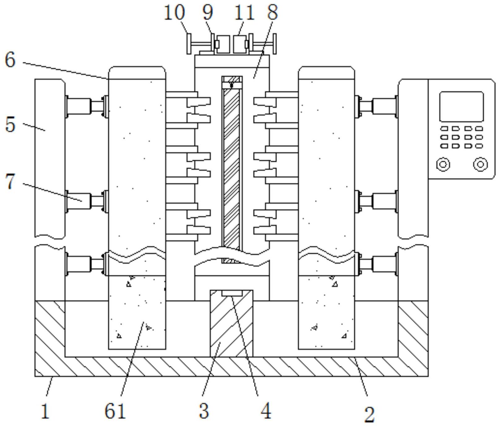 本发明公开了复合绝缘子芯棒和硅橡胶护套粘和度检测装置,包括底座板、夹持机构、液压缸、切割机构、芯棒和硅橡胶护套,所述底座板的上表面开设有滑轨,所述底座板的上方左右两侧均安装有侧板,所述夹持机构设置在滑轨的上方,所述底座板的后方螺栓安装有切割机构,且切割机构的上方螺栓安装有支架,并且支架的前方螺纹连接有螺纹杆,所述螺纹杆的末端安装有夹持块,所述芯棒设置在夹持块之间,且芯棒的下端设置在安装槽内部,并且芯棒的外表面粘接有硅橡胶护套。该复合绝缘子芯棒和硅橡胶护套粘和度检测装置采用自动化检测,不仅保证了检测的精准性,还能降低工人的劳动量,极大的增加了装置的实用性和便捷性。