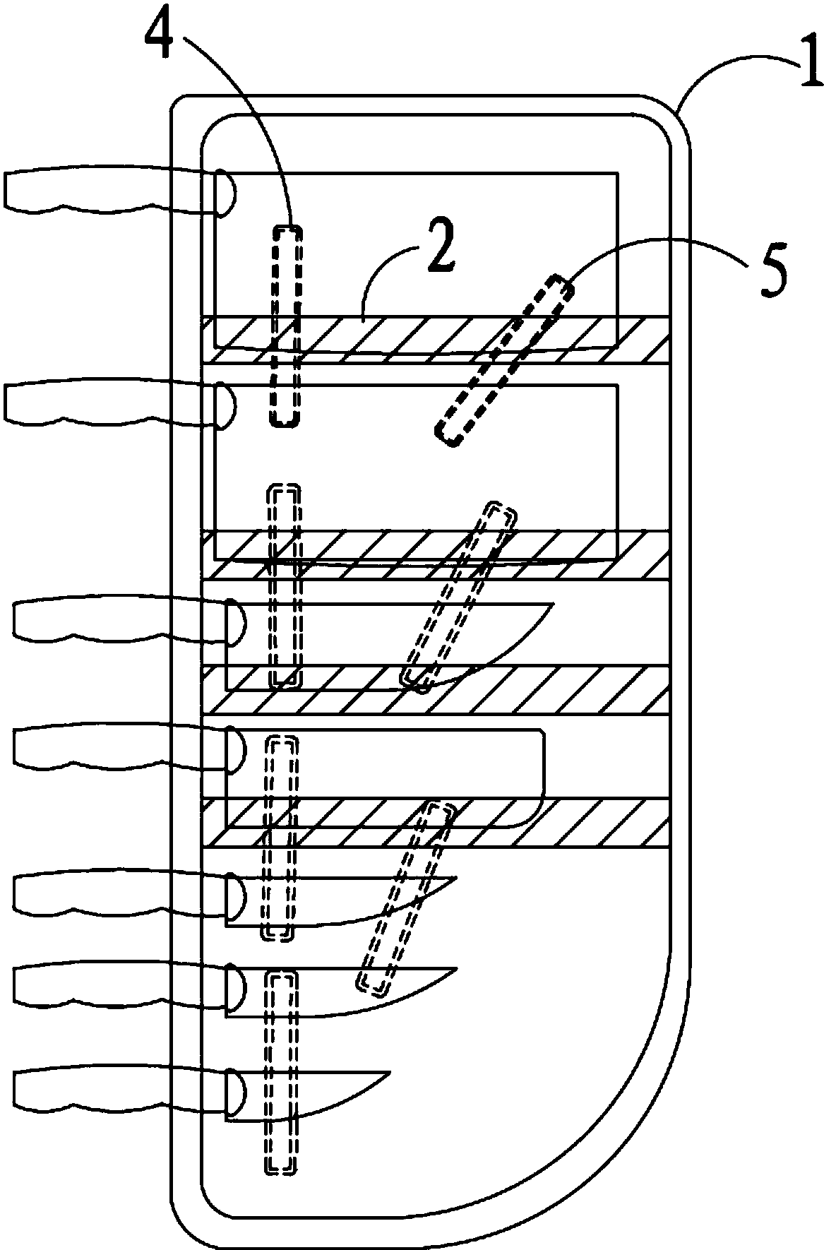 本实用新型提供一种刀具集成收纳盒,其包括:盒体、集成设置于所述盒体中的磁性件和保护壳;所述盒体具有底壁以及由所述底壁四周延伸而出的侧壁,所述盒体具有多个刀具收纳位,任一收纳位上设置有开设于所述侧壁上的卡槽,所述卡槽形成对其上刀具手柄的固定,所述磁性件位于所述盒体中的底壁上,所述磁性件对刀具提供磁性吸附作用力,所述保护壳按照所述收纳位的分布间隔设置,任一所述保护壳位于所述磁性件的上方,所述保护壳遮挡对应收纳位上刀具的刃口。本实用新型的刀具集成收纳盒能够实现厨房多把刀具的集成收纳,且其可采用悬挂的方式放置,避免占用操作台上的操作空间。