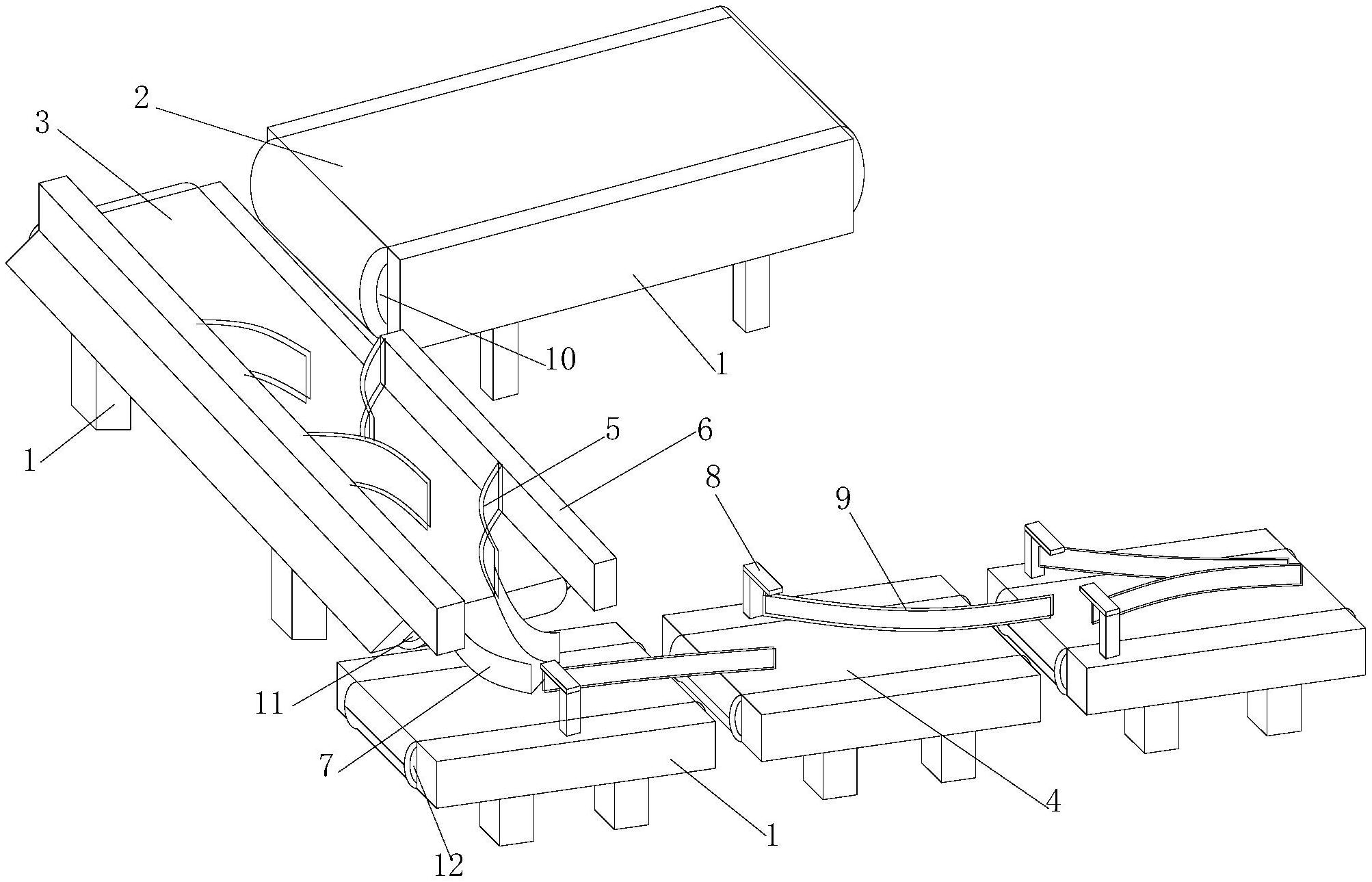 本实用新型公开了一种锥形甜筒料理装置,包括可在运动过程中使锥形甜筒大头朝上均匀进入包装机的传送料理装置、可将锥形甜筒均匀送入传送料理装置输入端的间断性送料装置、支撑主体,传送料理装置、间断性送料装置均固定连接在支撑主体上,传送料理装置输入端与间断性送料装置输出端连接;间断性送料装置包括第一传送带、间断性带动第一传送带运动的第一驱动组件,第一驱动组件位于第一传送带内侧两端;传送料理装置包括呈斜坡状排布的传送装置、可将锥形甜筒向传送装置传送面中间聚拢的挡板装置,挡板装置连接在传送装置两侧;与人工放饼相比提升了生产效率,减轻了人工劳动强度,降低了人工成本及人员手工放饼存在的产品交叉污染的隐患。