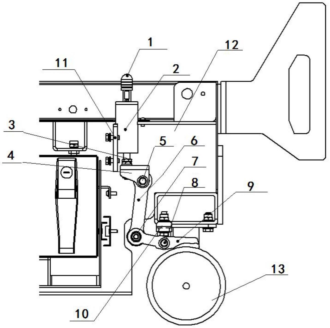 本实用新型公开一种人力迷你剪叉车底盘,包括:底盘本体、脚轮、弹力装置、刹车传动装置和刹车片,所述弹力装置一侧与所述底盘本体固定连接,所述弹力装置的顶端超出所述底盘本体的顶端水平面预定的距离,所述刹车传动装置一端与所述弹力装置的底端连接,所述刹车传动装置与所述刹车片远离所述脚轮的一端活动连接,所述刹车片设置于所述脚轮上方,还包括固定件,所述固定件的一端与所述底盘本体固定连接,所述固定件的另一端通过第一销轴与所述刹车片活动连接,所述刹车片靠近所述脚轮的一侧与所述脚轮抵接。本实用新型结构简单、可自动驻车,避免了人力迷你剪叉车工作时发生事故的可能,提升人力迷你剪叉车的安全性。