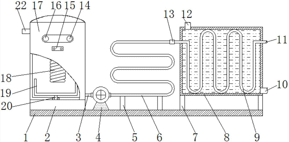 本实用新型公开了一种高温瞬时灭菌器的提速装置,包括承载板,所述承载板的顶部从左至右依次固定连接有机壳、水泵、第一支撑腿和第二支撑腿,所述机壳内腔底部的右侧固定连接有电机箱,所述电机箱内壁的底部固定连接有电动机,电动机的转轴上套设有主动齿轮。本实用新型通过设置保温蛇形管、冷却箱、冷却蛇形管、控制器、搅拌架、旋转轴、保温套、电动机、主动齿轮和从动齿轮,解决了现有的高温瞬时灭菌器工作效率低的问题,该高温瞬时灭菌器的提速装置,加热棒在加热的同时,搅拌架可对加热箱内的液体进行搅拌,增加了液体的受热效率,通过保温蛇形管和冷却蛇形管的配合使用,延长了蛇形管的长度,从而提高了工作效率。