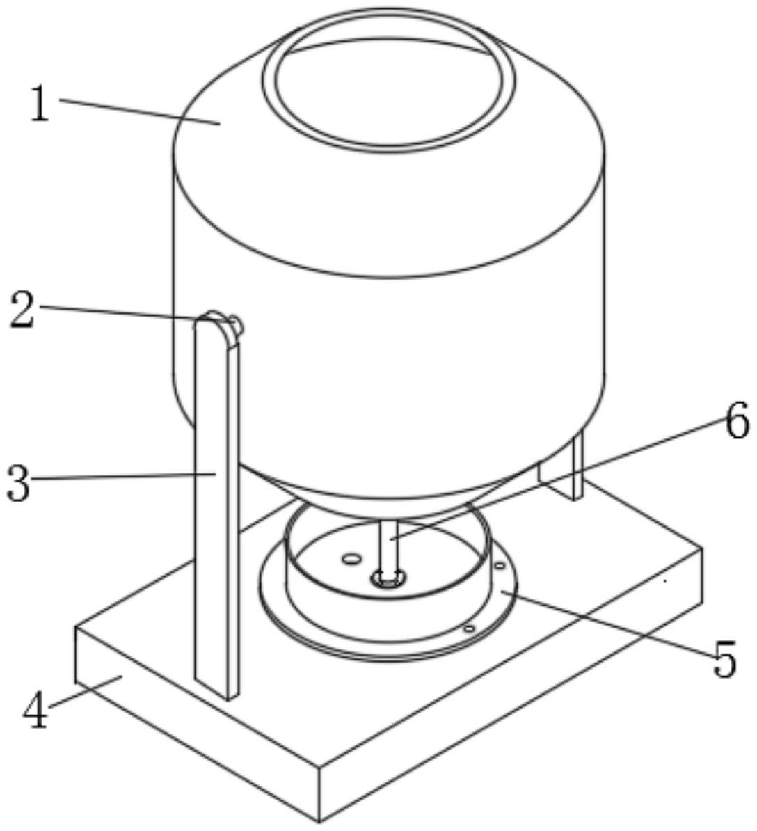 本实用新型公开了一种酸奶生产用的搅拌装置,涉及搅拌装置领域。包括设备底座,设备底座上固定安装有定位支架,定位支架上活动安装有活动轴,活动轴末端连接有搅拌罐体,搅拌罐体底部的设备底座上固定安装有收集机构,收集机构包括收集槽体、排水口、进水口、安装底座和安装螺孔,安装底座固定安装于设备底座上表面,安装底座边缘处开设有安装螺孔,安装底座上固定安装有收集槽体,收集槽体中间位置开设有进水口,收集槽体底部位于进水口一侧开设有排水口,收集槽体中间位置固定安装有清洗机构。净水输送到定位管道中之后通过清洗喷头喷出,净水通过清洗喷头喷出之后可以上下移动活动管道,从而对搅拌罐体进行全面的清洗。