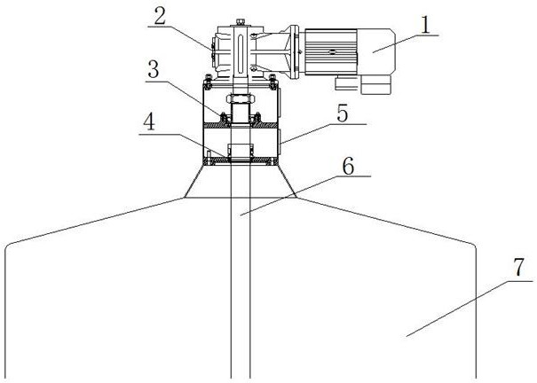 本实用新型公开了一种低温发酵罐搅拌装置顶部安装结构,包括罐体、通心搅拌轴、减速机,所述减速机位于罐体外部顶端,所述罐体上部设置密封连接区,所述密封连接区与罐体相互独立,所述密封连接区包括轴承、密封件、搅拌支架,所述轴承、密封件安装于所述搅拌支架上,所述通心搅拌轴穿过所述密封件、轴承与减速机连接。与现有技术相比,能够最大程度的降低产品污染,避免卫生死角的形成,同时降低搅拌轴发生故障的几率,采用改进后的安装结构,极大的增强了产品质量,降低了生产成本。