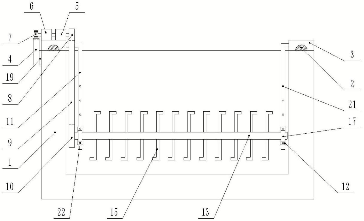 本实用新型公开了一种普洱茶发酵翻堆机,包括两个导轨和两个滑块;其中一个滑块的上端面安装有双轴电机和减速器;双轴电机的一侧输出轴与减速器连接,发酵槽的外壁连接有齿条,齿条的齿形面向上;减速器的输出轴上安装有齿轮;双轴电机的另一个输出轴上安装有主动轮;两个滑块的相对的一侧侧壁上分别连接有“L”形连杆,两个“L”形连杆之间转动安装有转轴;转轴的一端安装有被动轮;主动轮通过皮带与被动轮连接;转轴上安装有翻堆件。本申请可以适用于尺寸较大的发酵槽,相比于工人使用铲子进行翻堆,工作效率高,翻堆效果好,有助于提高发酵质量。