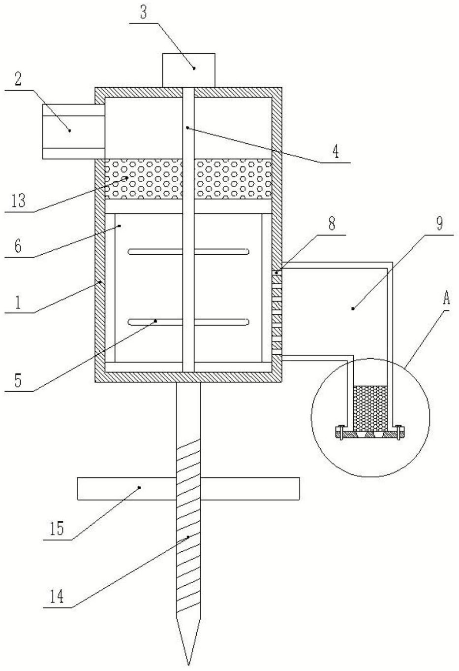 本实用新型公开了一种茶叶种植滴灌装置,包括外筒体;外筒体左侧上端连通有进水管,右侧下端开设有出水孔;外筒体的上下底之间转动安装有转轴,转轴的顶端与电机连接;转轴的侧壁通过连杆固定连接有内筒体,内筒体的侧壁上设置有开口;内筒体转动过程中,开口可以与出水孔对正或偏移;外筒体位于出水孔的外壁处连接有“L”形弯管;“L”形弯管的出口端安装有出水板,出水板上开设有滴灌孔。本申请能够调节有效的出水孔的数量,实现调节滴灌水流量的作用,可以针对茶园中不同树龄的茶树进行针对性调节。