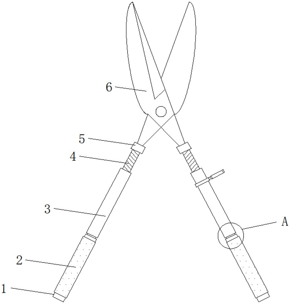 本实用新型公开了一种用于茶叶种植的修剪设备,包括第一握把、第二握把、第一螺纹柱和剪刀头,所述剪刀头底部两侧均固定有固定块,所述固定块与第一螺纹柱一端固定连接,所述第二握把一端开设有第一螺纹槽,所述第一螺纹柱另一端与第一螺纹槽螺纹连接,所述第二握把另一端开设有第二螺纹槽,所述第二螺纹槽内螺纹安装有第二螺纹柱,所述第二螺纹柱固定在第一握把的一端,所述第一握把上套装有橡胶套,一个所述第二握把上套装有圆环,另一个第二握把上卡接有卡接环,圆环与卡接环之间通过连接条固定。本实用新型具有剪刀柄的长度可以调节,可根据使用者的需求改变,便于使用的优点。