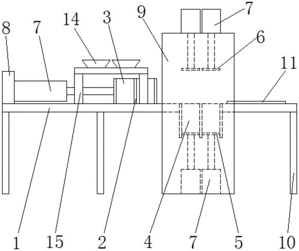本实用新型公开了一种茶叶砖成型机,包括工作台,所述的工作台顶部设有可左右滑动的送料模,所述的送料模内设有至少一个搬运腔,所述的工作台下部开设有压紧腔,所述搬运腔与压紧腔的数量相同,且所述搬运腔与压紧腔的大小相同,每个所述的压紧腔底部均设有可在其内腔上下滑动的顶出板,每个所述的压紧腔上方均设有可上下滑动以分别插入搬运腔和压紧腔内的压紧板,所述送料模、顶出板和压紧板的一侧均设有驱动它们运动的驱动件。本实用新型的茶叶砖成型机,结构紧凑,使用方便能够同时压制多个茶砖,使茶砖压制的更加紧密,大大提高了工作效率和茶砖的一致性,降低了劳动强度,确保了产品的质量。