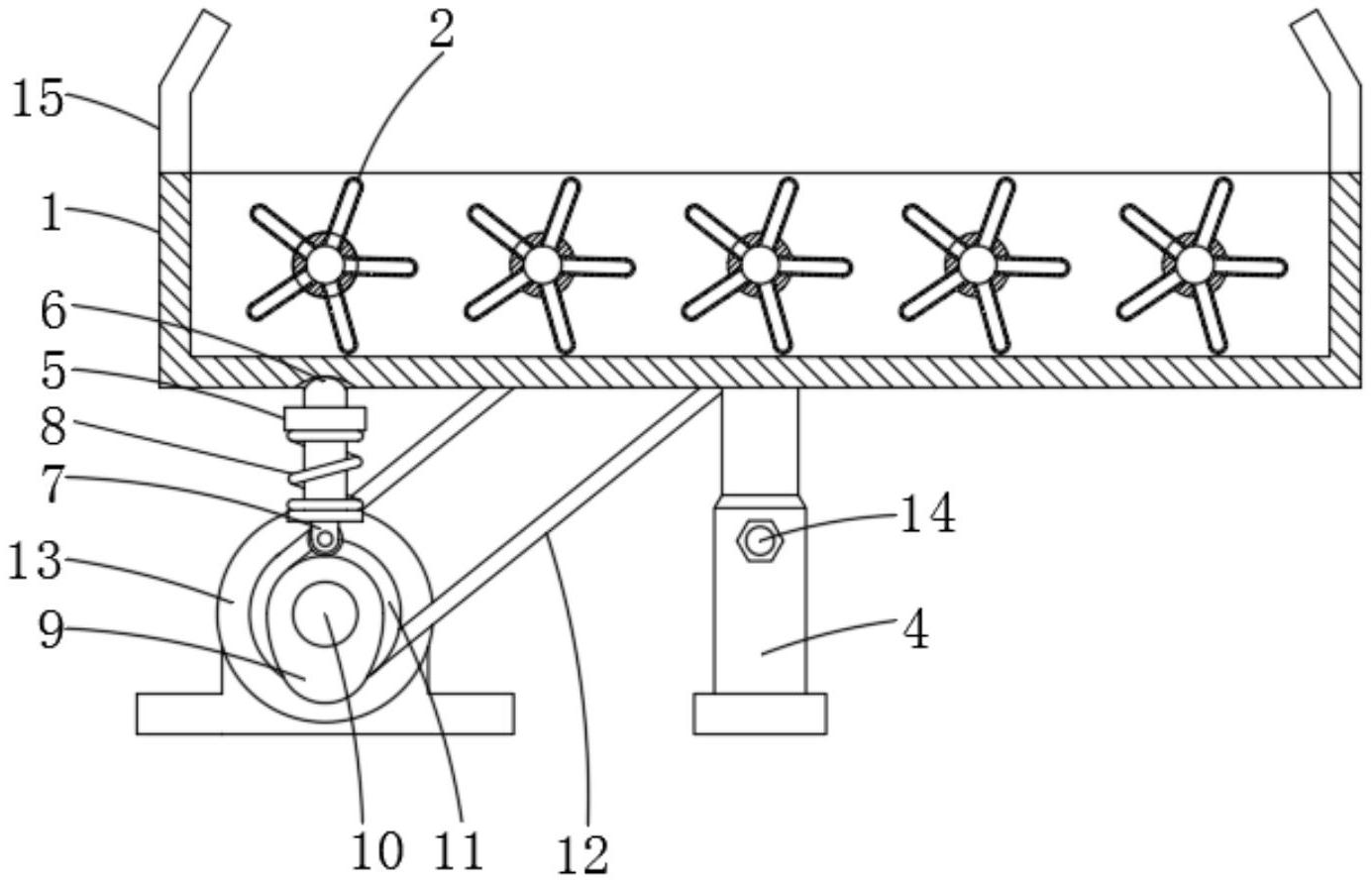 本实用新型涉及红茶发酵技术领域,尤其涉及一种应用于红茶处理用的发酵槽,解决了现有技术中茶叶在发酵过程中发酵效果较差,导致茶叶发酵不均匀的问题。一种应用于红茶处理用的发酵槽,包括槽体,槽体内部转动连接有多个呈中空状的搅拌杆,多个搅拌杆位于槽体的同一端通过传动件传动连接,槽体的中心两侧均转动连接有固定支架,槽体的位于固定支架的一侧设有安装板,安装板的内部穿设有两个呈对称分布的滑动杆。本实用新型通过驱动电机的驱动,带动槽体随着固定支架摆动,使槽体表面的茶叶通风通氧的流动性更好,又可以带动搅拌杆带动槽体内部的茶叶进行搅拌,对搅拌杆内部进行通风通氧处理,使槽体内部的茶叶通风通氧的流动性更好。