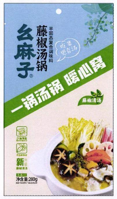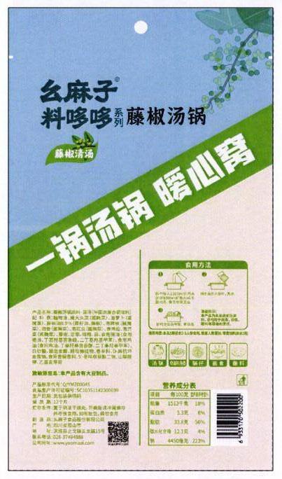 1.本外观设计产品的名称:包装袋(藤椒汤锅底料);2.本外观设计产品的用途:本外观设计产品用于汤锅底料的包装;3.本外观设计产品的设计要点:产品外部的图案;4.最能表明本外观设计设计要点的图片或照片:主视图;5.本外观设计产品为平面包装,其他视图无设计要点,故省略其他视图。