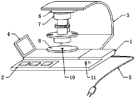 本实用新型公开了一种用于缝合针生产的针头直径限定装置,包括装置本体,所述装置本体由设置在该装置本体底部的工作台及设置在该工作台一侧的曲型板构成,所述工作台的底部设有电源线,所述工作台的侧面设有显示屏,所述工作台的顶部设有插针器,该种用于缝合针生产的针头直径限定装置,能够通过对向设置的声呐器进行发声,利用声音传播原理,计算缝合针到声呐器之间的距离,准确的得出缝合针的直径,并能够通过捕捉摄像头拍摄到放大的缝合针,并展现在显示屏上供工作人员进行仔细分析,进一步得到准确直径,有效的解决了传统人为测定缝合针直径造成的误差,同时检测速度快,安装针十分方便。