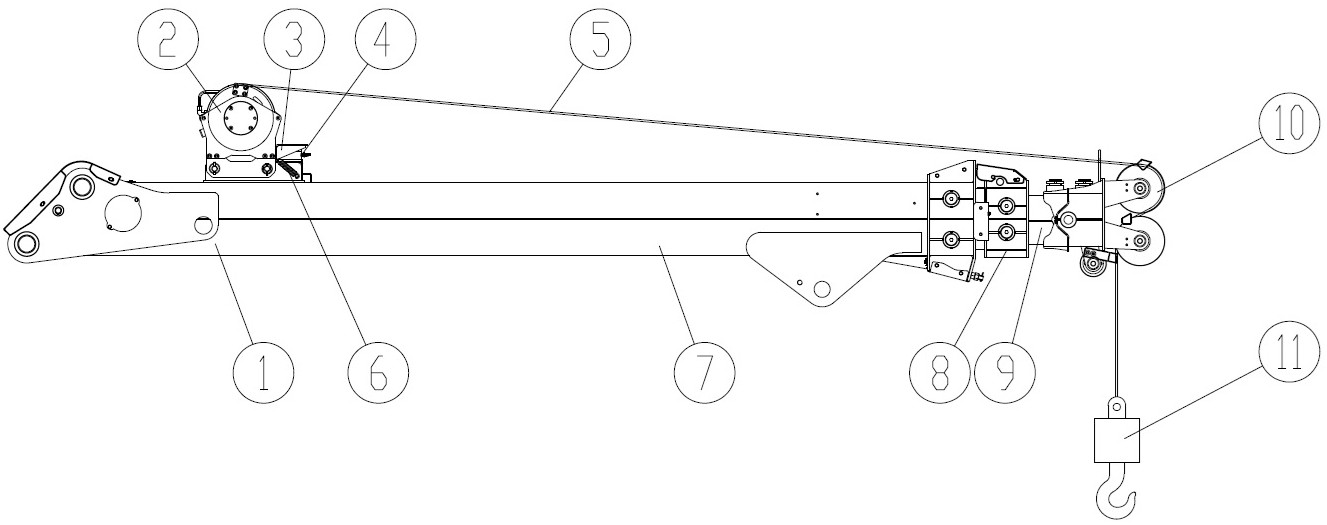 本实用新型公开一种起重机械负载测量机构,包括:伸缩臂、绞车、检测架、称重传感器、钢丝绳、预紧弹簧、滑轮组件及吊钩,所述的检测架通过销轴连接在伸缩臂上,使检测架绕销轴能做小角度转动,绞车固定在检测架上,钢丝绳一端通过滑轮组件与吊钩连接,钢丝绳另一端缠绕在绞车的滚筒上,称重传感器设置在伸缩臂与检测架之间,预紧弹簧两端分别固定于伸缩臂与检测架上,使检测架始终与称重传感器接触。该测量受结构件形变影响较小,对负载的测量更加准确;结构简单、完善;不依赖于设备其它机械部件,应用范围更广,设备适应性较强。