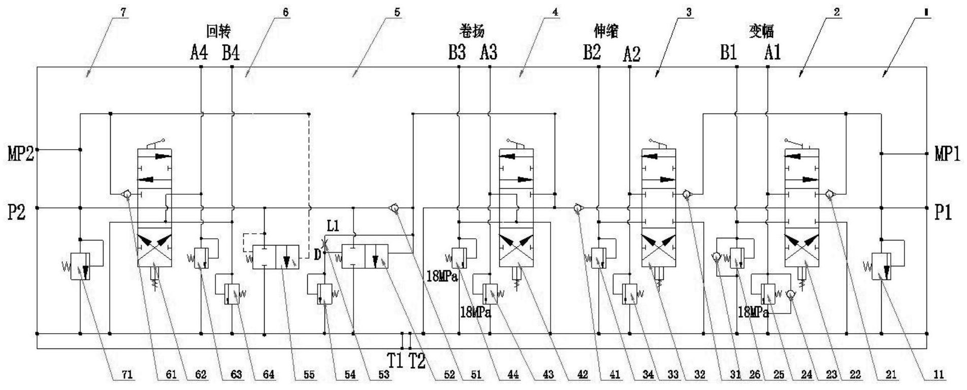 本发明公开了一种随车起重机多路换向装置,包括进油油路,回油口,用于操作变幅油缸的起升、停止和落回三种动作的变幅换向阀,用于操作伸缩油缸的伸出、停止和缩回三种动作的伸缩换向阀,用于操作卷扬马达的上升、停止和下降三种动作的卷扬换向阀,用于操作回转马达的正向、停止和逆向三种动作的回转换向阀及功能模块,变幅换向阀和伸缩换向阀并联进油油路两端,回转换向阀、功能模块和进油油路串联,伸缩换向阀和功能模块合流后与卷扬换向阀、回油口依次串联;本装置实现了变幅与卷扬、变幅与回转、伸缩与卷扬、伸缩与回转以及回转与卷扬等五种复合动作,无需比例多路阀即可实现复合动作,有效减低成本、提高了直臂随车起重机的性价比。
