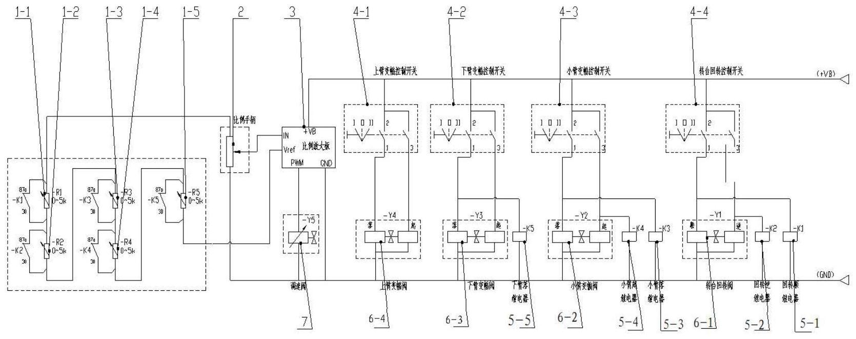 一种折臂式高空作业车的臂架操控电路,包括电比例手柄,与电比例手柄电性连接的比例放大器,与比例放大器电性连接的动作控制开关,与动作控制开关电性连接的动作选择阀,比例放大器的输出端连接调速阀,所述的电比例手柄的输入端串联分压电阻,所述的动作控制开关电性连接速度选择继电器的线圈,所述的速度选择继电器的常闭开关与分压电阻并联,本发明能够自动适应不同类型动作对速度控制的要求,且结构简单、容易实现,具有低成本、高可靠性、高安全性的优点。