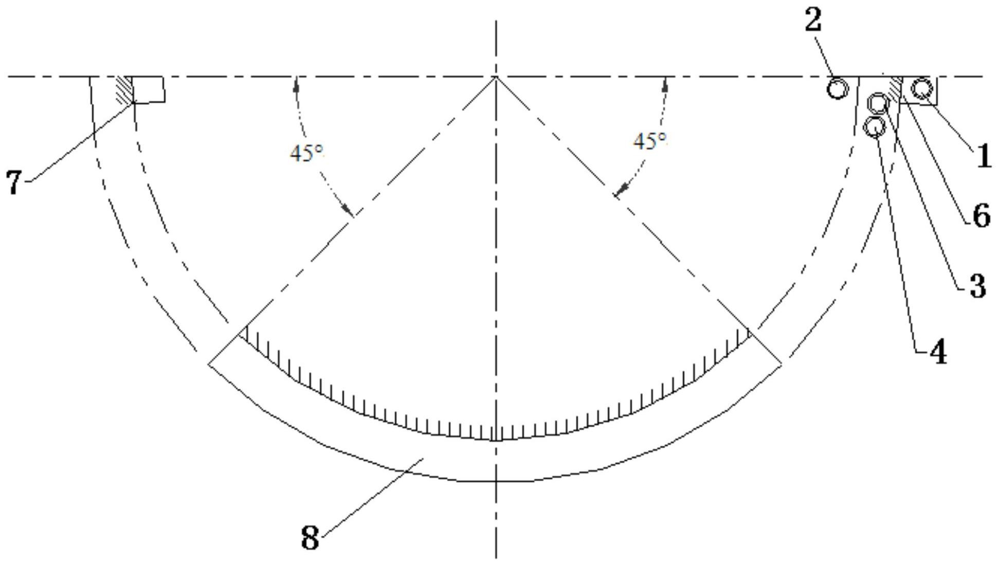 本发明公开了一种桥梁检测车工作平台安全工作区域控制装置,包括五个检测开关、四个检测板;其中第三检测板为弧形检测板,对应安全角度区域;第一检测开关通过接触第一检测板检测工作平台初始角度0°位置,第二检测开关通过第二检测板检测工作平台最大回转角度180°位置;第三检测开关和第四检测开关通过第三检测板检测工作平台回转至安全角度区域范围,第五检测开关通过第四检测板检测工作平台伸缩装置缩到位;通过四个位置检测开关检测平台回转的位置,通过一个位置检测开关检测平台是否全缩到位,结合外围控制电路,控制回转平台在安全区域内可以伸出工作平台,且伸出后禁止转出安全角度区域,在非安全区域内禁止伸出工作平台。