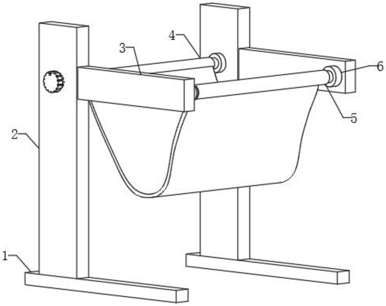 本实用新型公开了一种贴膜雕刻机收纳布收卷设备,包括支撑架、支撑板、连接板、转辊一、转辊二、固定块和收纳布,所述支撑架的上方一侧固定连接有支撑板,所述两侧支撑板之间设置有转辊一,所述支撑板的侧壁上固定连接有连接板,所述两侧连接板远离支撑板的一端侧壁固定连接有固定块,所述两侧固定块之间设置有转辊二。本实用新型结构简单,通过将转辊二箱固定块的方向推动,使转辊二的两端对连接槽内部的移动板进行挤压,从而对内部的弹簧进行挤压,方便将转辊二从固定块上取下,在转动旋钮和转辊一进行收卷,防止收纳布表面堆积灰尘,通过设置固定杆和支撑板一侧开设的限位孔结合,可以将收卷好的转辊一固定住,防止其转动,提高稳定性。