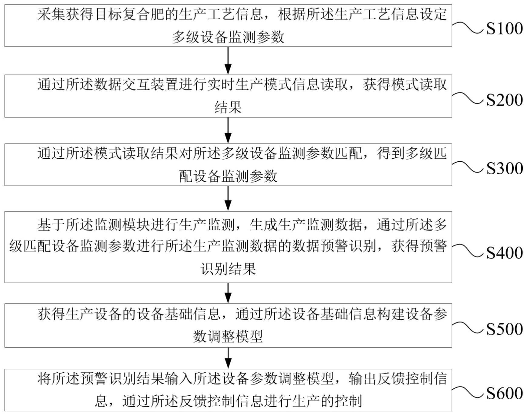 本发明公开了一种基于模块化DCS的复合肥生产控制方法及系统,涉及复合肥技术领域,该方法包括:采集获得目标复合肥的生产工艺信息,设定多级设备监测参数;通过数据交互装置进行实时生产模式信息读取,获得模式读取结果;匹配多级设备监测参数,得到多级匹配设备监测参数;基于监测模块进行生产监测,通过多级匹配设备监测参数进行生产监测数据的数据预警识别,获得预警识别结果;通过设备基础信息构建设备参数调整模型;将预警识别结果输入设备参数调整模型,输出反馈控制信息,通过反馈控制信息进行生产的控制。本发明解决了现有技术中存在复合肥生产控制准确率低,无法保证生产质量的技术问题,达到了智能化控制复合肥生产的技术效果。