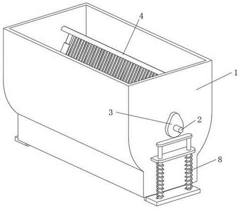 本实用新型公开了一种防结块散料机构,涉及防结块技术领域,具体包括箱体,所述箱体的侧壁转动连接有旋转轴,所述旋转轴位于箱体外部两端的外表面均固定连接有椭圆轮,所述箱体的内部设置有打散机构,所述箱体的内部位于打散机构下方的位置设置有等距离分布的横杆,每个所述横杆的两端均与箱体的内壁转动连接,通过旋转轴、箱体和打散机构之间的配合,首先旋转轴转动的时候能够使打散机构转动,进而能够对箱体内部的氮肥进行打散,同时在打散机构的作用下,也能够对箱体的内壁进行清理,使氮肥不会吸附在箱体的内壁上,进而解决了现有技术存在在对氮肥进行打散的时候,氮肥可能吸附在内壁上,进而对后续氮肥打散造成影响的问题。