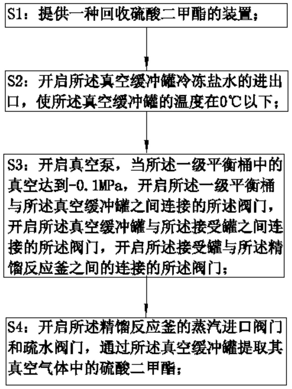 本发明提供一种从真空气中回收硫酸二甲酯的方法。所述从真空气中回收硫酸二甲酯的方法包括以下步骤:步骤一:提供一种回收硫酸二甲酯的装置;步骤二:开启所述真空缓冲罐冷冻盐水的进出口,使所述真空缓冲罐的温度在0℃以下;步骤三:开启真空泵,当所述一级平衡桶中的真空达到‑0.1MPa,开启所述一级平衡桶与所述真空缓冲罐之间连接的所述阀门,开启所述真空缓冲罐与所述接受桶之间连接的所述阀门;步骤四:开启所述精馏釜的蒸汽进口阀门和疏水阀门,通过所述真空缓冲罐提取真空气中携带的硫酸二甲酯。本发明提供的从真空气中回收硫酸二甲酯的方法具有有效减缓气体的流速、提高气体的滞留时间、硫酸二甲酯精制回收效率高、无废水污染的优点。