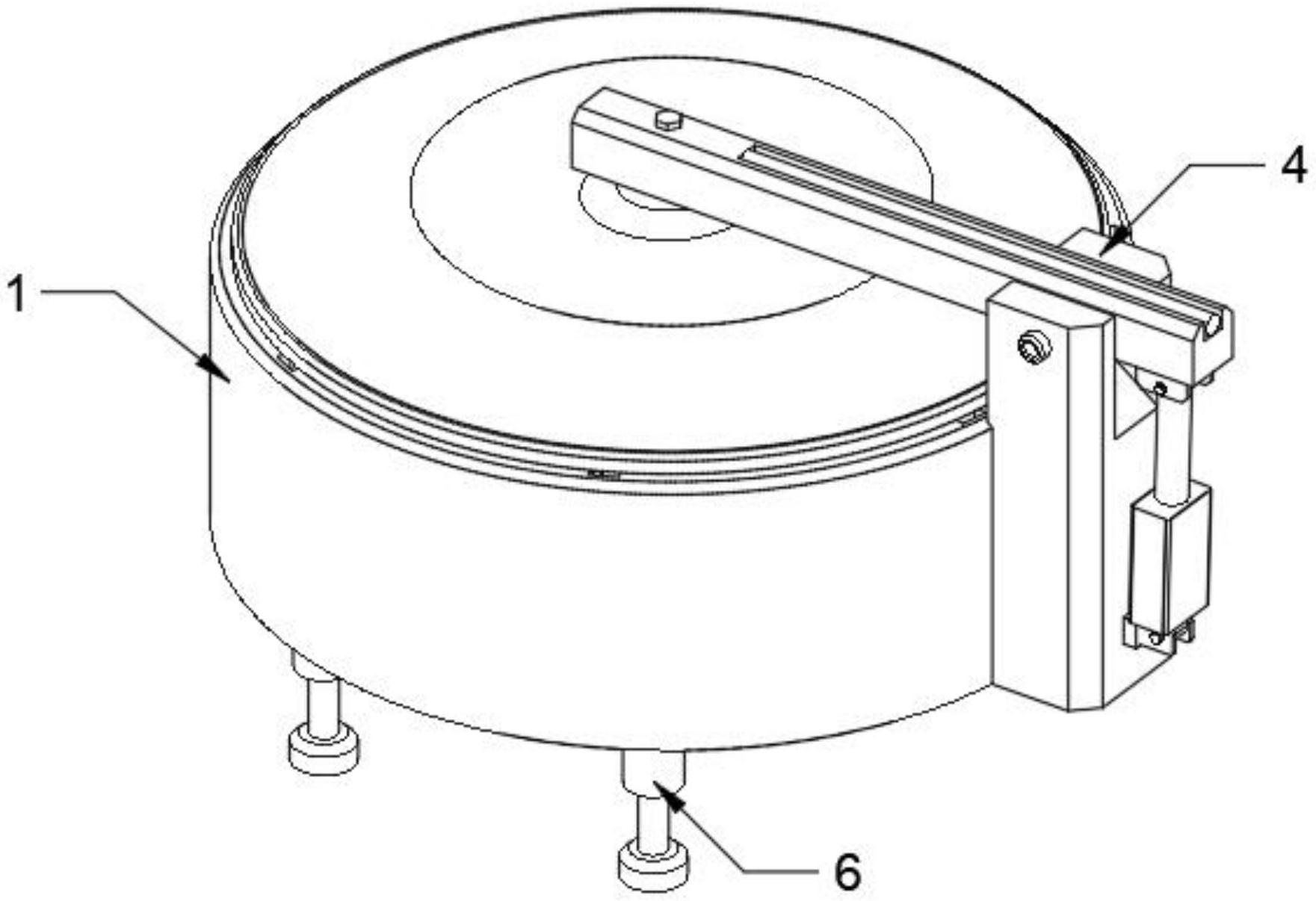 本实用新型公开了一种白酒生产用原粮蒸煮装置,包括主体架和使用槽,所述主体架的顶部开设有使用槽,所述主体架的一侧开设有安装槽,所述主体架一侧安装槽固定安装有封盖机构,所述主体架的内部中央开设有安装孔,所述主体架内部安装孔内安装有升降机构,且升降机构的一端固定安装在地面上,所述封盖机构包括安装座、转动杆、滑槽、固定块、顶盖、连接座、气缸、连接块和联动块,所述主体架的安装槽内固定安装有安装座,所述安装座的顶部开设有凹槽,此白酒生产用原粮蒸煮装置的结构简单、操作便捷,可以通过升降机构配合工作人员对蒸煮好的原料进行卸料,增加了设备在使用时的便捷性,此设备的实用性较高。