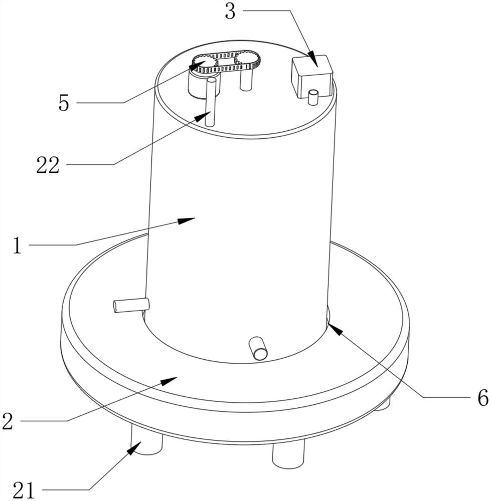 本实用新型公开了一种老酒保值增值的酒庄存储设备,包括储酒罐和底座,所述储酒罐的顶部固定连接有制冷器,所述储酒罐的内部安装有回流管,所述回流管的一端与制冷器的出口连通,所述回流管的另一端穿过储酒罐的一侧与制冷器的进口端连通,所述储酒罐的顶部固定连接有转动装置,所述底座的中部滑动连接有夹紧装置,本实用新型通过观察温度计的变化,控制制冷器的开启和关闭,进而通过制冷器制取冷气顺着回流管对储酒罐内部的白酒进行降温,保持白酒处于适宜的储存温度,在制冷器工作的过程中,通过转动装置对白酒进行缓慢的搅拌,使酒精的各处温度大致相同,通过夹紧装置的使用,对储酒罐进行固定,防止倒塌。