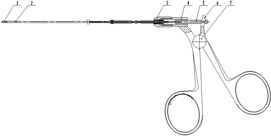 本申请涉及一种超细内窥镜手术钳,包括钳芯组件、钳杆组件、连接螺母、前手柄、拉杆后接头、后手柄、手柄螺钉,钳芯组件套装在钳杆组件上,钳芯组件、钳杆组件固定连接,钳芯组件的拉杆穿过钳杆组件与拉杆后接头固定连接,拉杆后接头穿过前手柄与后手柄连接,前手柄、后手柄通过手柄螺钉铰接,连接螺母套装在钳杆组件上并与前手柄固定连接,所述钳芯组件通过两个连接片的副销轴分别连接上钳头副销孔、下钳头副销孔,拉杆前接头前端通过拉杆销穿过两个连接片的拉杆销孔与两个连接片铰接,拉杆前接头后端与拉杆固定连接。本申请与现有技术相比,具有以下优点和效果:结构简洁,强度好;装配成本低,使用方便,稳定性好,内窥镜手术更加安全。
