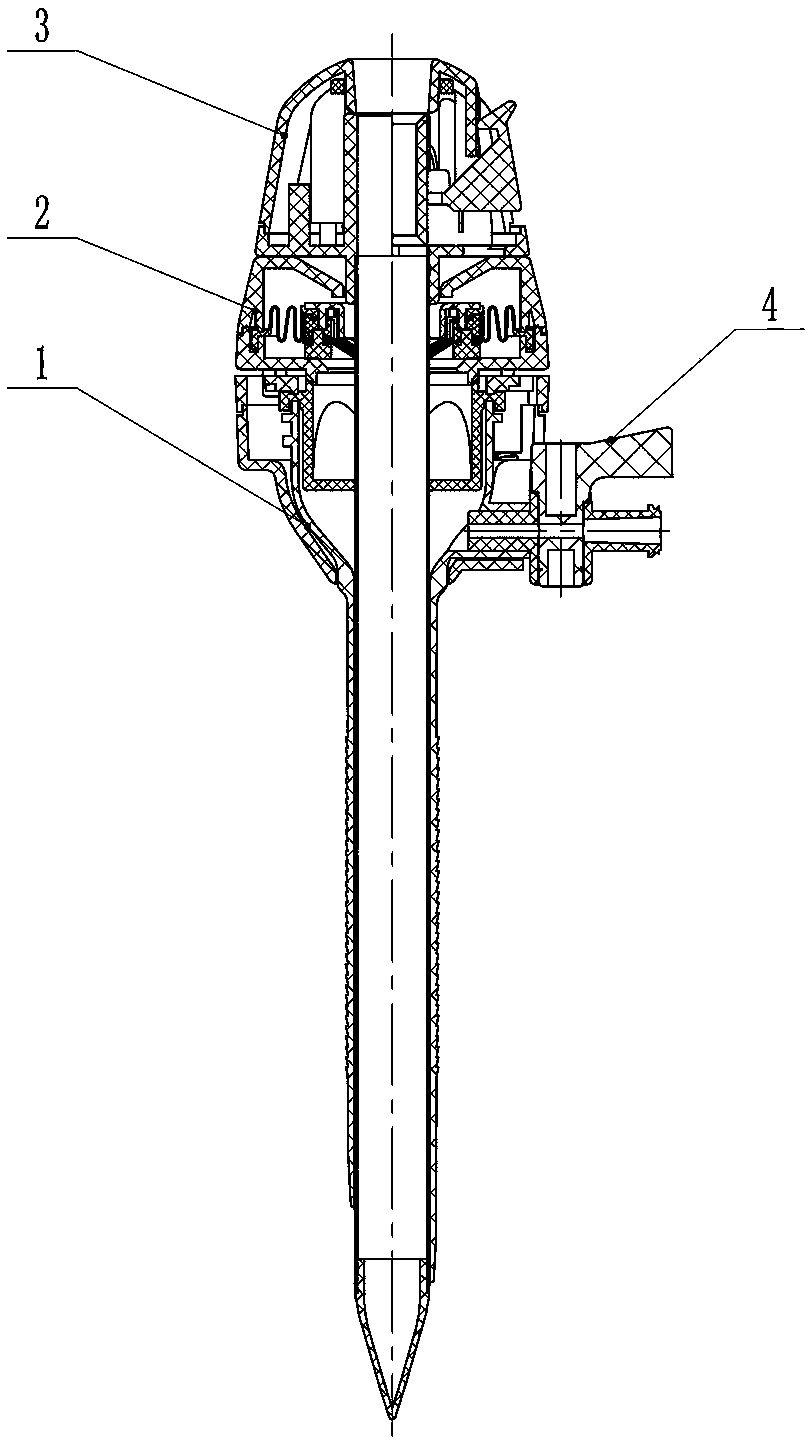 本发明涉及一种穿刺器,它主要适用于人体的腹腔镜手术中。本发明包括套管组件、密封组件、针组件和气阀体组件,其特征在于:在套管组件中还安装有压缩弹簧、支撑杆和定位销,压缩弹簧和支撑杆相互接触并设置在套管下盖和套管上盖之间,定位销与套管上盖连成一体并使套管上盖与套管下盖之间通过过盈配合;在套管上盖上分别开有长槽、卡口槽、定位槽、弹簧孔和支撑杆定位孔;密封下盖的下端还设置有与密封下盖连成一体的旋转卡扣,该旋转卡扣通过卡口槽和长槽与所述的定位槽相配合。本发明的连接结构设计更合理,密封性能更好,且在灭菌、包装、运输过程中即便产生挤压、碰撞、震动,也不会使密封组件脱落,设计及使用安全可靠。