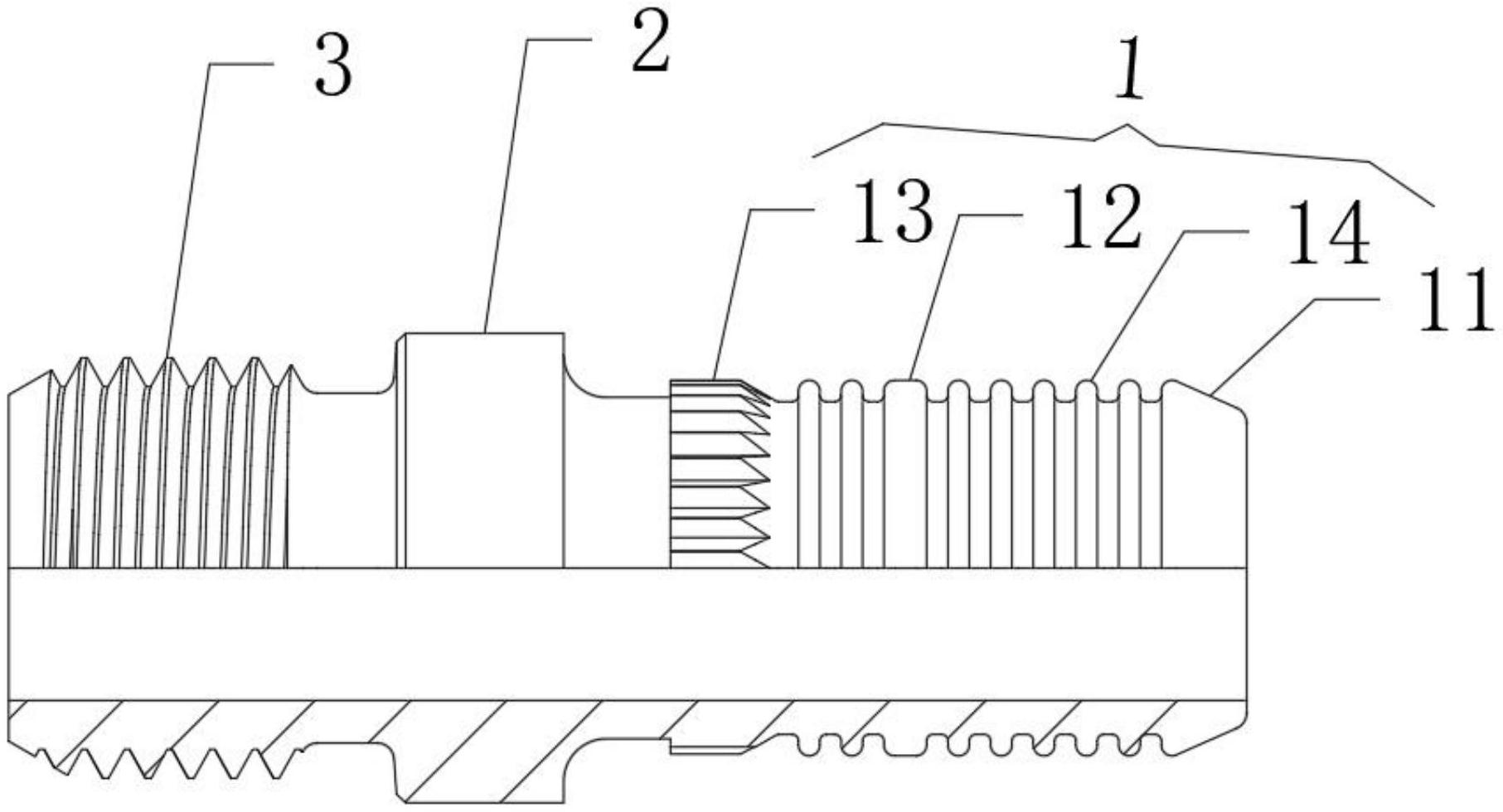 本实用新型公开了一种波纹胫的外牙,涉及到外牙和外牙技术领域,包括胫主体、和固定设置于胫主体一端的钢套限位挡肩及与钢套限位挡肩相配合的外牙主体,其中所述胫主体和外牙主体均设置成中空结构,所述胫主体包括导向肩、支撑肩、滚齿和软管限位挡圈,所述导向肩和滚齿设置于支撑肩的两侧。本实用新型通过将胫主体设置成导向肩、支撑肩、滚齿和软管限位挡圈,不仅提高胫主体的整体强度,减小其在冲压过程中产生的变形,减小因管径变形对流量的影响,而且利用软管限位挡圈的设置,使软管与外牙接触面更加均匀,受力也更加均匀,从而提高连接可靠度,使软管与胫主体接触面均为圆弧接触,避免尖锐棱角对软管造成损坏使密封性能下降。