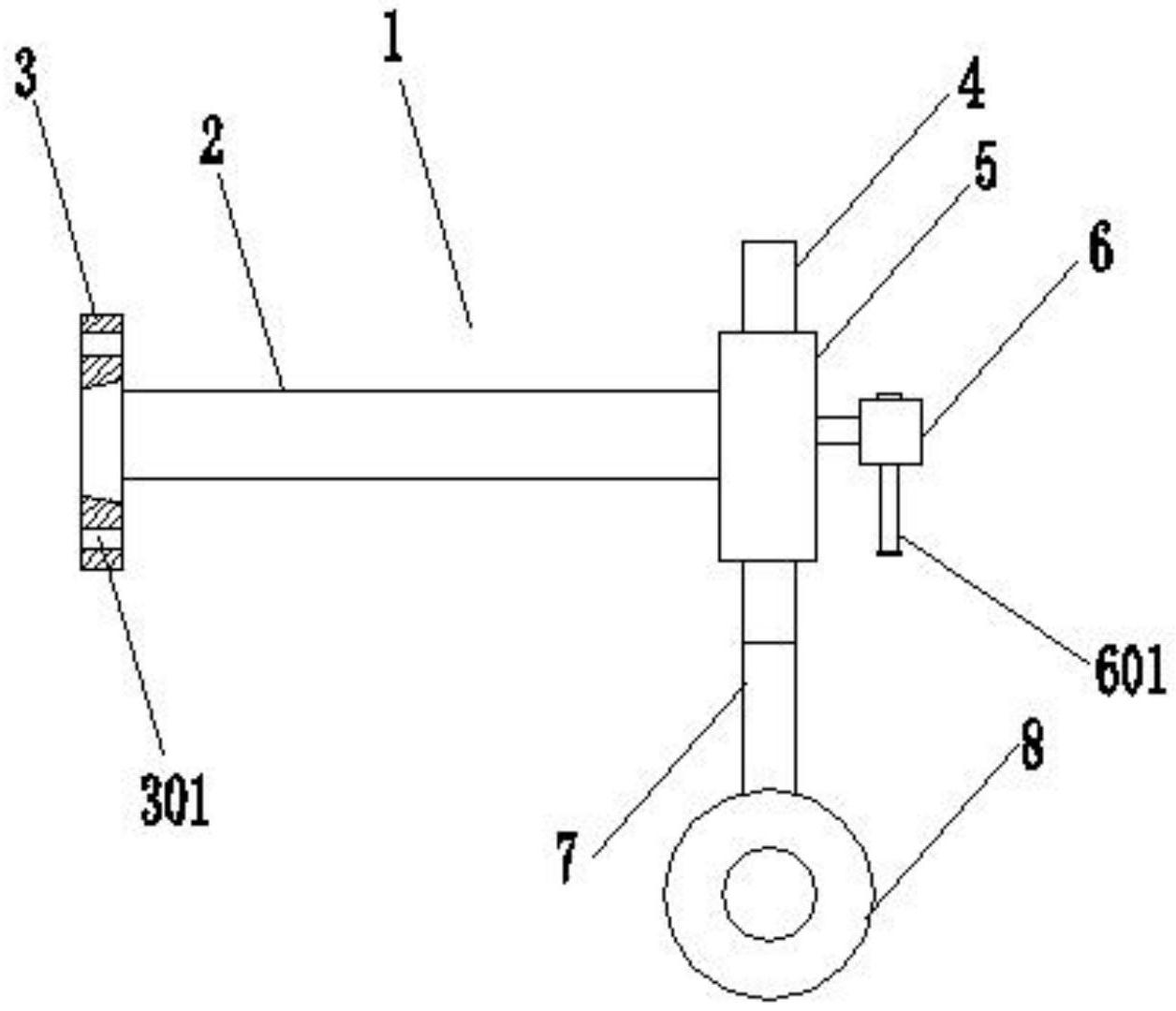 本实用新型公开了一种微耕机的前支撑装置,装置本体设延伸杆,延伸杆的一端设连接板与微耕机一前端固定安装,延伸杆的另一端设导套,内设连接孔,向下分叉的支撑脚上端设连接柱,连接柱向上伸展后装入连接孔内套接,拧紧固定螺栓把连接柱与导套轴向锁定,支撑脚的两个分叉下端内设轴承,支撑轴与两侧的轴承连接并伸出支撑脚的两个分叉外端,内设轴承的支撑滚轮分别与露出支撑脚的两个分叉外端的支撑轴连接固定,本实用新型固定安装在微耕机前端,延伸杆向前伸展,支撑滚轮与地面接触,大大提高微耕机的稳定性和操作的安全性,适合丘陵,山区,地块小,高差大,又无机耕道,而专门为果园、菜地、温室大棚、丘陵坡地和小块作业。