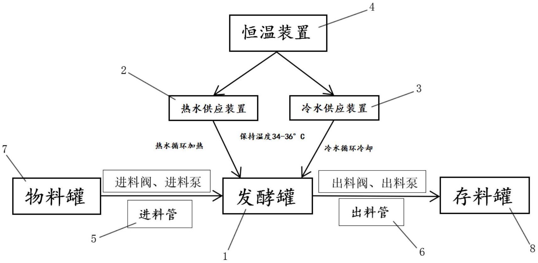 本实用新型公开了一种新会陈皮中药酵素饮料串联式现代发酵装置,包括多个串联连接的发酵罐、热水供应装置、冷水供应装置和恒温装置,每个所述发酵罐均连接有进料管和出料管,第一个所述发酵罐的进料管连通物料罐,前一个发酵罐出料管连通后一个发酵罐的进料管,最后一个所述发酵罐的出料管连通存料罐;所述热水供应装置、冷水供应装置分别连接于所述发酵罐的外层,所述恒温装置连接于所述热水供应装置和冷水供应装置。本实用新型有利对多种中药材酵素原料发酵,适用范围广、实用性强,有利于向全国酵素饮料行业和企业推广,更有利于实施产品、产业供应链规模化、集团化标准化大生产。