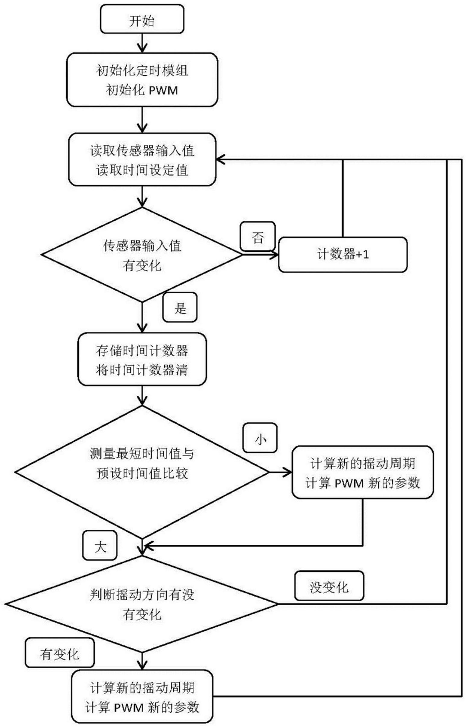 本发明公开了一种摇动控制方法,包括双光电传感器和光栅,通过检测光栅遮断或者开通部分通过光电传感器的时间;在每个摇动周期中,将最短时间值与预设摇动幅度对应的时间值进行比较,当最短时间值与预设时间值不相等时,产生调节电机输出功率的控制信号以使摇动幅度达到预设摇动幅度;检测当前摇动方向;判断当前摇动方向是否发生变化,当发生改变时,产生调节电机输出功率的控制信号以做同向补充加力。本发明通过计算光栅遮断或者开通部分通过光电传感器的时间值,来控制秋千摇摆的速度,提高控制精度,有效解决精度不足的问题。并且根据摇动方向对应做正反向同向补充加力,可以提前修正摇动动力。