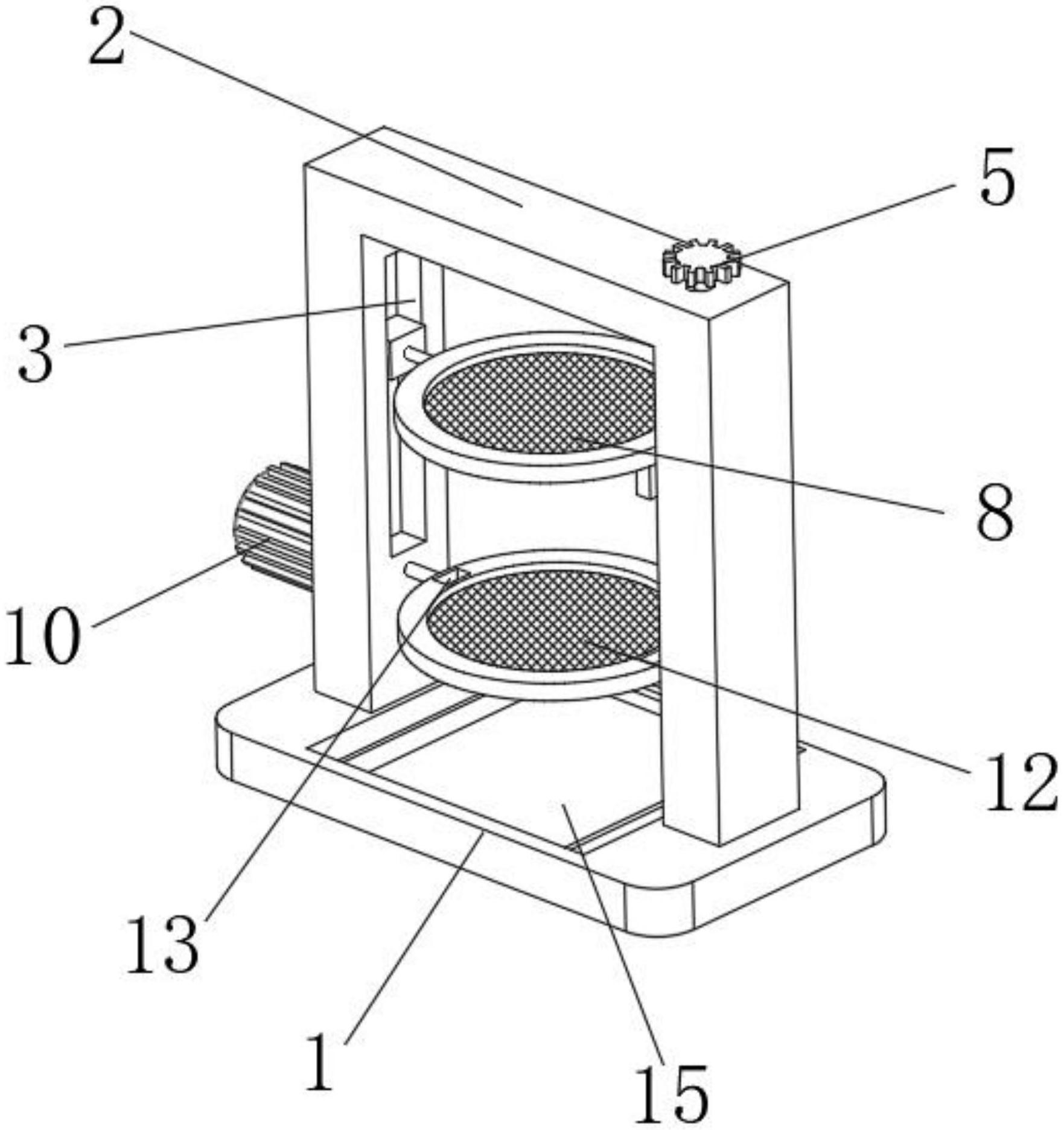 本实用新型提供一种肉制品风干用晾晒支架,属于晾晒支架技术领域,本实用新型,它是由底座、U型支架、滑槽、螺纹杆、转轮、滑块、连接杆、第一第一晾晒网、卡块、电机、转杆、第二晾晒网和卡槽构成,滑块的表面转动连接有连接杆,连接杆远离滑块的一端固定安装有第一晾晒网,第一晾晒网的底部表面固定安装有两个卡块,U型支架的侧面固定安装有电机,电机的输出端转动连接有转杆,转杆的表面固定安装有第二晾晒网,第二晾晒网的顶部表面固定安装有两个卡槽。本实用新型,解决了现有的肉制品风干用晾晒支架,在给肉制品晾晒时,需要人工手动给肉制品进行翻面,这种操作方法一方面导致晾晒不均匀。另一方面也导致晾晒过程效率低下的问题。