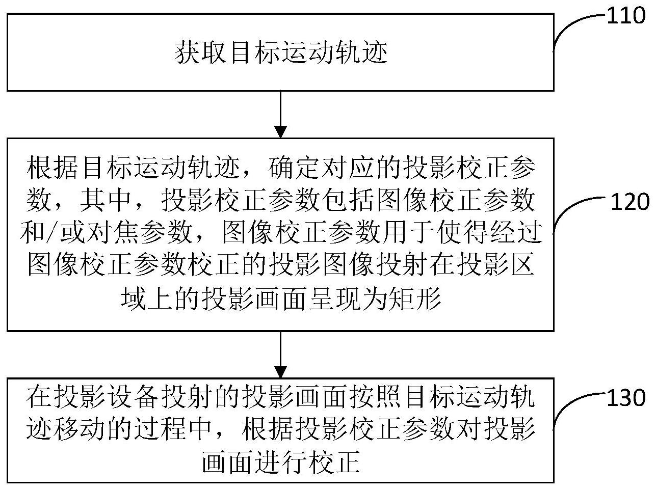 本公开涉及一种投影画面校正方法、装置、存储介质以及投影设备,涉及投影技术领域,该方法通过获取目标运动轨迹,根据目标运动轨迹,确定对应的投影校正参数,其中,投影校正参数包括图像校正参数和/或对焦参数,图像校正参数用于使得经过图像校正参数校正的投影图像投射在投影区域上的投影画面呈现为矩形,在投影设备投射的投影画面按照目标运动轨迹移动的过程中,根据投影校正参数对投影画面进行校正。由此,能够实现在投影设备进行动向投影的过程中,投影设备投射的投影画面始终保持为矩形和/或投影设备的投影焦距始终能够保持最佳焦距,以提高用户在投影设备进行动向投影时的投影观看体验。
