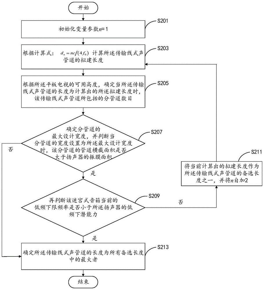 本发明实施例提供的迷宫式音箱的设计方法中,传输线式声管道的长度根据平板电视的尺寸参数及扬声器的共振频率共同计算确定。将该种迷宫式音箱的设计方法应用于平板电视,能够在不提升系统成本、不增加平板电视厚度及体积的情况下,有效改善平板电视的低频频响效果,为用户营造较为震撼的听音环境,提升用户听觉体验。