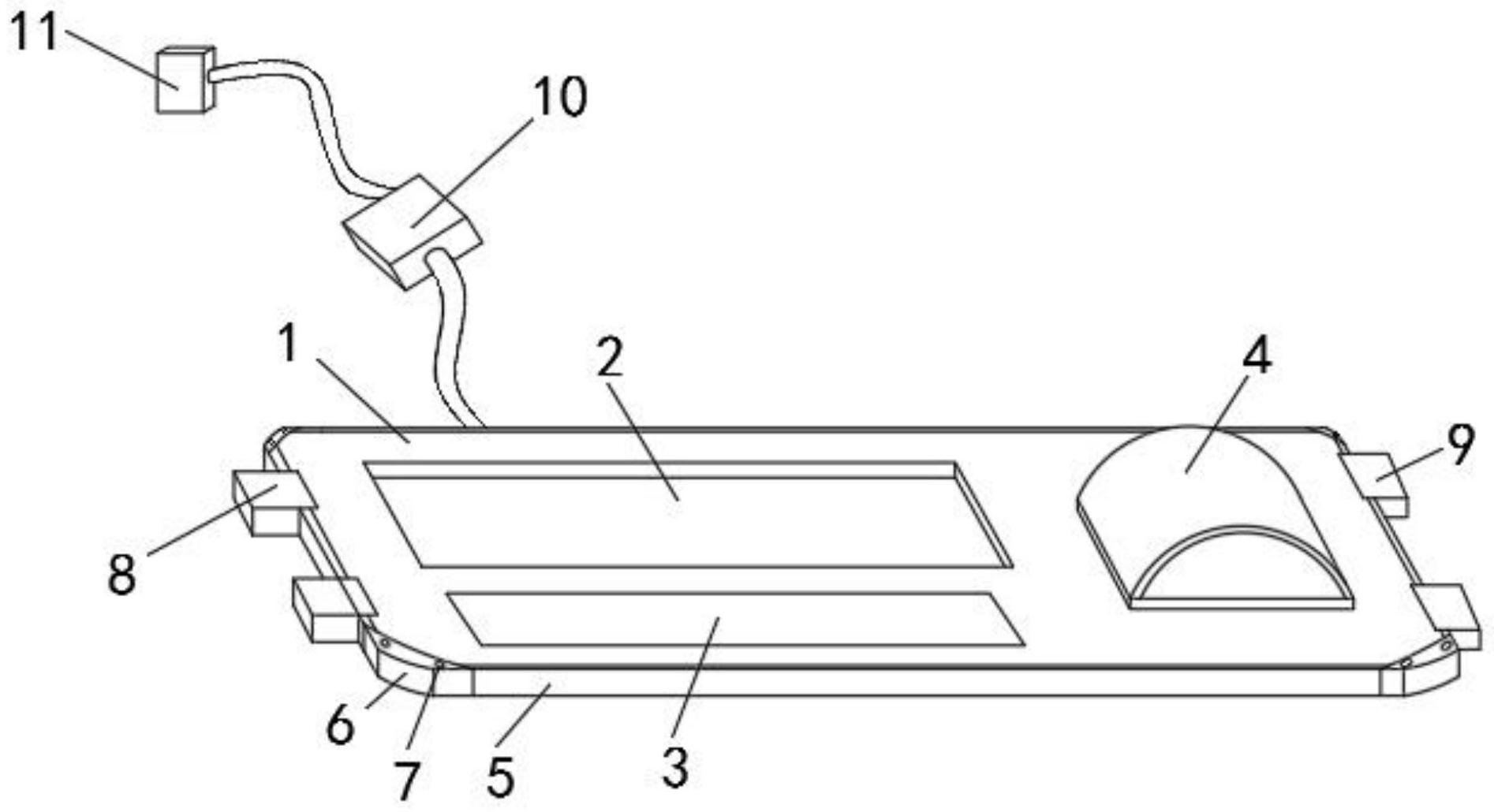 本发明公开了一种带有散热组件的高安全性能的发热桌垫,包括桌垫主体,所述桌垫主体的顶端开设有定位槽,且桌垫主体的顶端内侧靠定位槽的嵌入安装有腕部调节垫。本发明通过设置定位槽配合散热腔,能够有效的防止在使用发热桌垫时桌垫的热量对键盘使用的影响,能够较好的对键盘进行热量隔离,避免温度过高导致键盘失灵的情况出现,且设置有腕部调节垫随着电热丝加热可以在使用时有效的缓解使用者腕部的疲劳,设置保温套能够在气温较低时对使用者手部进行保温,且有效的避免温度过高对鼠标使用的干扰,设置卡座与对接座可以方便对桌垫进行折叠收纳,且保证桌垫在折叠之后不会松散,避免了直接将桌垫卷起收纳导致桌垫侧边变弯不能复位的情况出现。