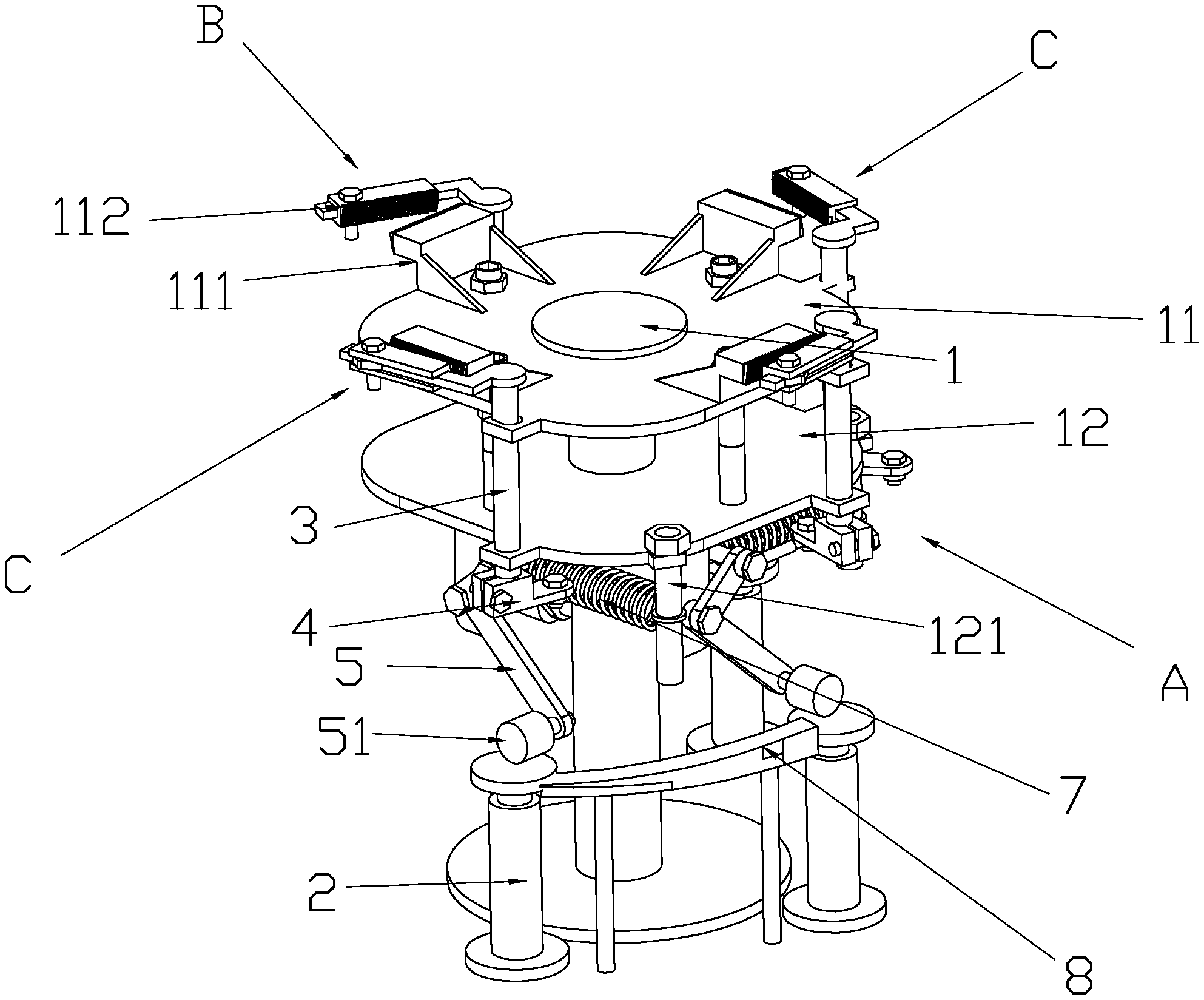 本实用新型涉及一种给袋式真空包装机的转盘式抽真空转运装置,包含有转轴转盘以及夹持爪,转盘包含有上料工位、过渡工位以及两两对应的输出工位,夹持爪包括静夹持爪以及动夹持爪,动夹持爪上均设有驱动装置,上料工位与输出工位均设有驱动源,驱动装置包括设置在固定盘与轴杆,轴杆一端与动夹持爪连接,另一端延伸至固定盘下方,且该端设有与轴杆相连接的联动座以及与联动座相连接的传动装置,传动装置与联动座之间还设有控制夹持爪自动闭合的自闭合装置,本实用新型的有益效果:通过设置转盘与转盘的两两对应的上料、过渡与输出工位,使得真空抽取机构无需停滞等待,提高转运效率,从而提升整个设备的包装速度,完成高效率的包装。