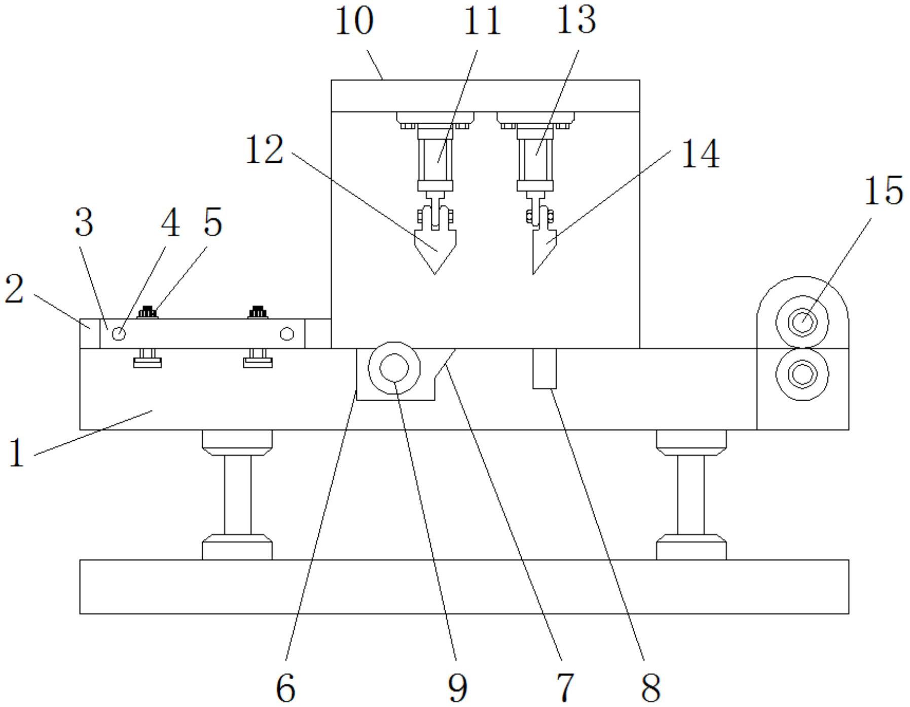 本实用新型公开了一种空气过滤网生产用打折机,包括加工台和支撑座,所述加工台的上方前后凸边,且加工台的上端设置有限位板,所述限位板的左右两端均穿设有导杆,且限位板的上方左右两端均安装有螺栓,所述加工台的内部从左到右依次设置有安装槽、打折槽和剪切槽,所述支撑座位于加工台的上端,所述第一液压杆的下端安装有打折模具,所述第二液压杆的下端设置有剪切刀,所述加工台的右端安装有输出轮。该空气过滤网生产用打折机,与现有的普通打折机相比,增加结构的同时大大提高了整个打折机的使用性能,改良后的打折机内部拥有便于对空气过滤网进行压折结构,并且拥有对空气过滤网剪切结构,有效满足了人们的使用需求。