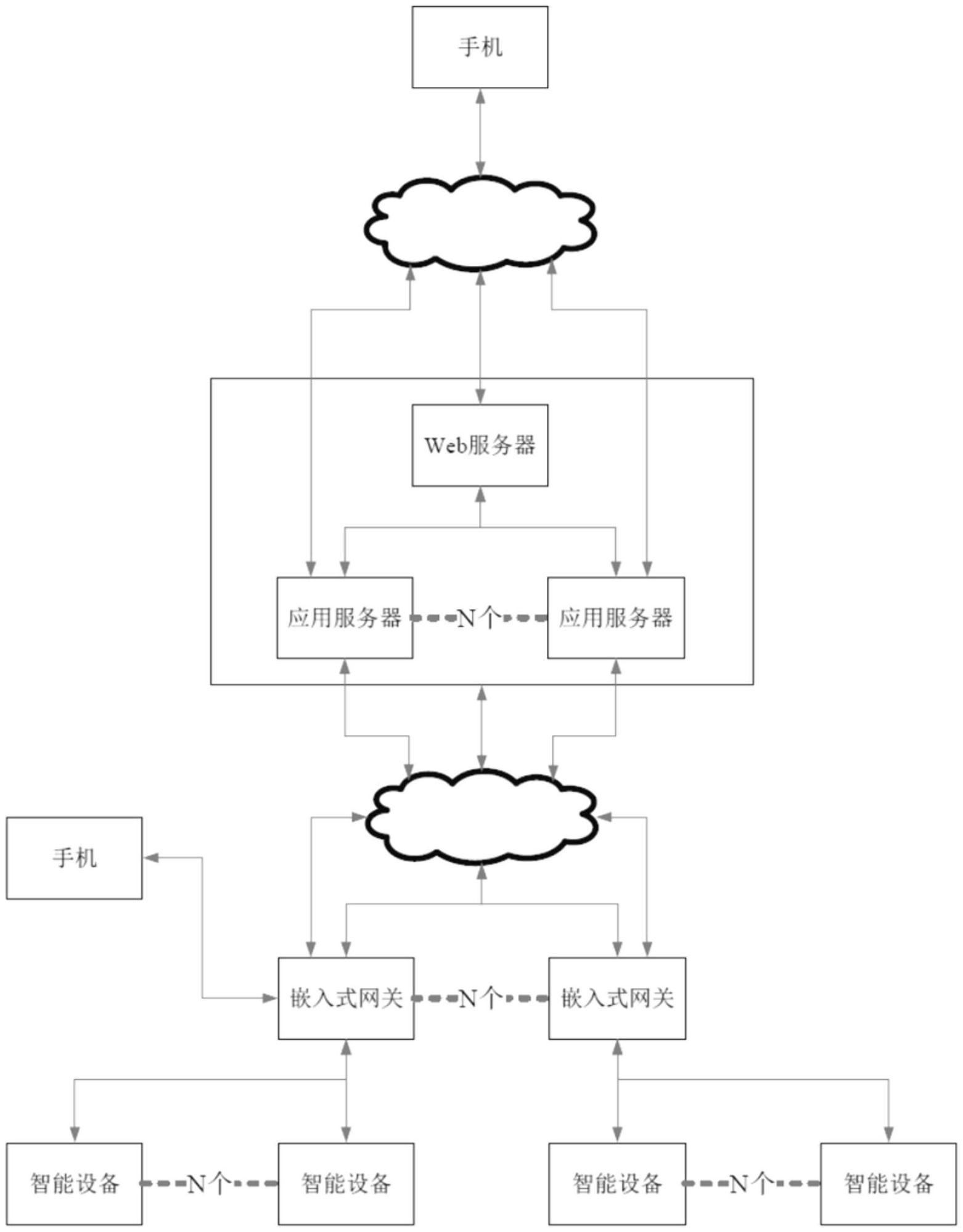 本发明公开了一种智能家居用户、应用服务器管理负载均衡的系统及方法,包括由手机、Web服务器、一台以上的应用服务器、一台以上的嵌入式网关以及与嵌入式网关连接的一台以上的智能设备组成的管理系统;web服务器和多个应用服务器保持通信,一个以上的智能设备与嵌入式网关通信连接,手机连接嵌入式网关或者连接Web服务器。本发明用通俗易懂的方法(HTTP方式,HTTP服务器原生支持集群)处理大量用户登录,以及多个应用服务器(如一般TCP服务器、MQTT服务器等)负载均衡问题,设备和服务器的负载均衡协商方法采用HTTP方式传输处理。