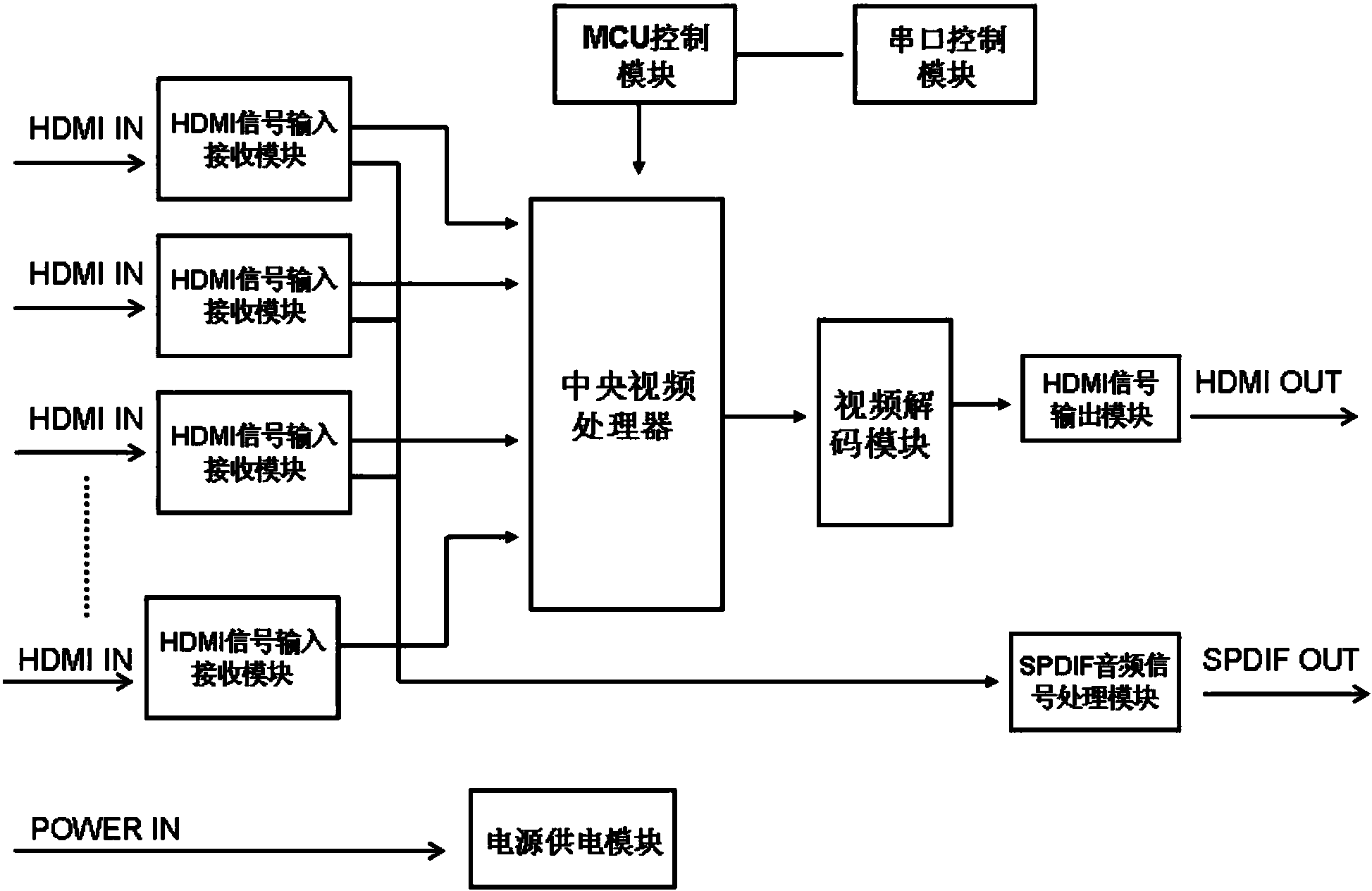 本实用新型公开了一种HDMI多路输入无缝切换画面分割器,包括电源模块,与电源模块相连的HDMI信号输入收接模块、中央视频处理器以及视频解码模块,视频解码模块与HDMI输出端口相连接,HDMI信号输入收接模块与数字音频输出模块相连。本实用新型分割器可以将4路高清数字视频信号显示在同一个屏幕上,并有多种视频分割效果,同时四路高清输入信号可做无缝切换。该分割器控制方式多样灵活,可通过前面板按钮、红外遥控、RS232控制。