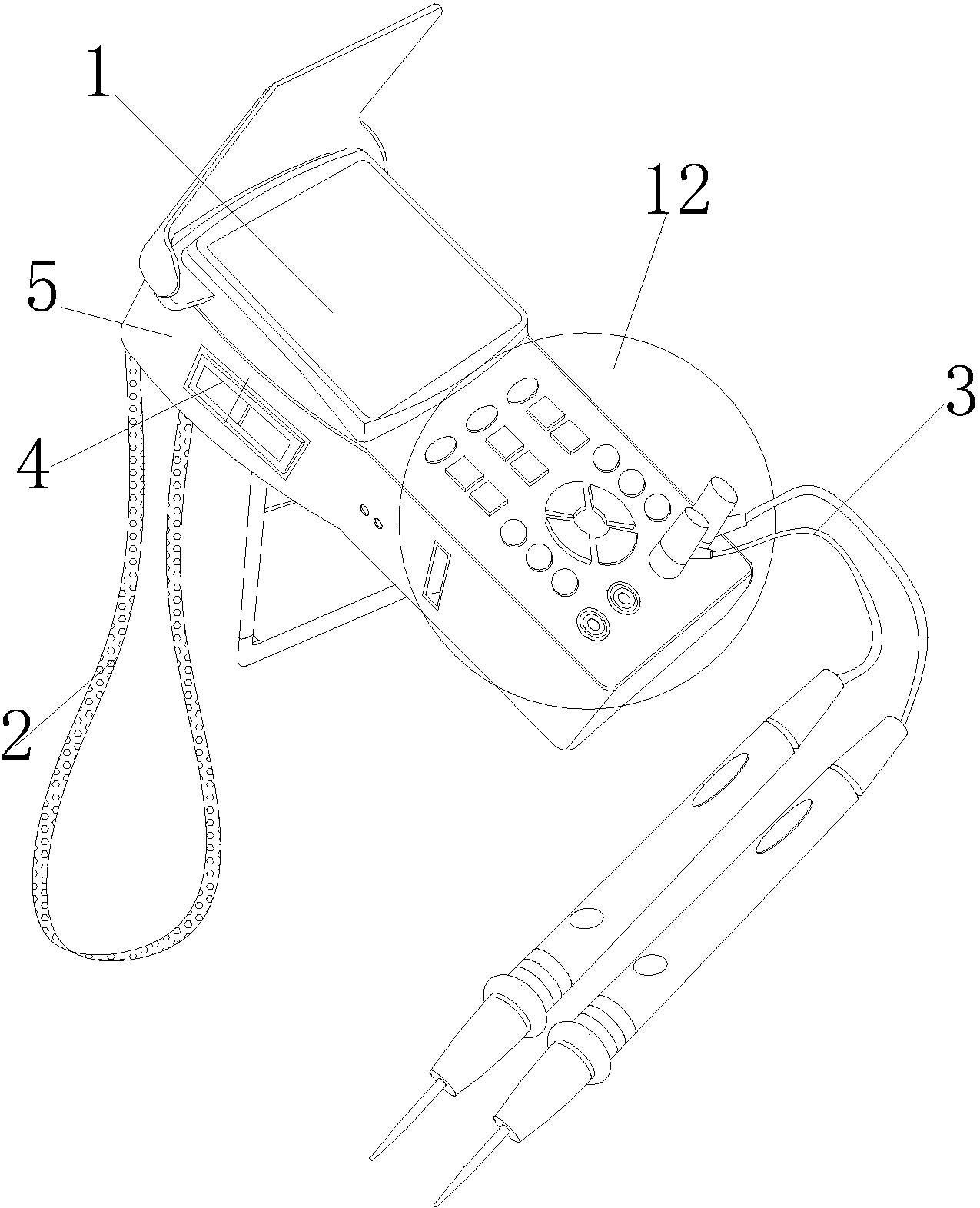 本实用新型公开了一种电子信息工程用万能表,其结构包括:万能表、挂绳、检测表笔、U盘读取装置、防摔胶套,万能表为手机状,万能表背面设有挂绳,挂绳通过孔洞贯穿万能表且与万能表相连接,检测表笔一端连接万能表,另一端与外部接触连接,U盘读取装置嵌设于万能表内部并设于左端面,防摔胶套与万能表套设连接并设于万能表外部,万能表设有表体、显示屏、功能按键、防摔盖,表体表面设有显示屏。本实用新型的有益效果是通过设有U盘读取装置可方便讲检测信息拷贝到电脑进行检测分析和研究或存档,不需要再表体上查看,屏幕小且不方便操作,并且设置带有收纳带的防摔胶套,可以放置备用电池,继续使用不会中途中断使用。
