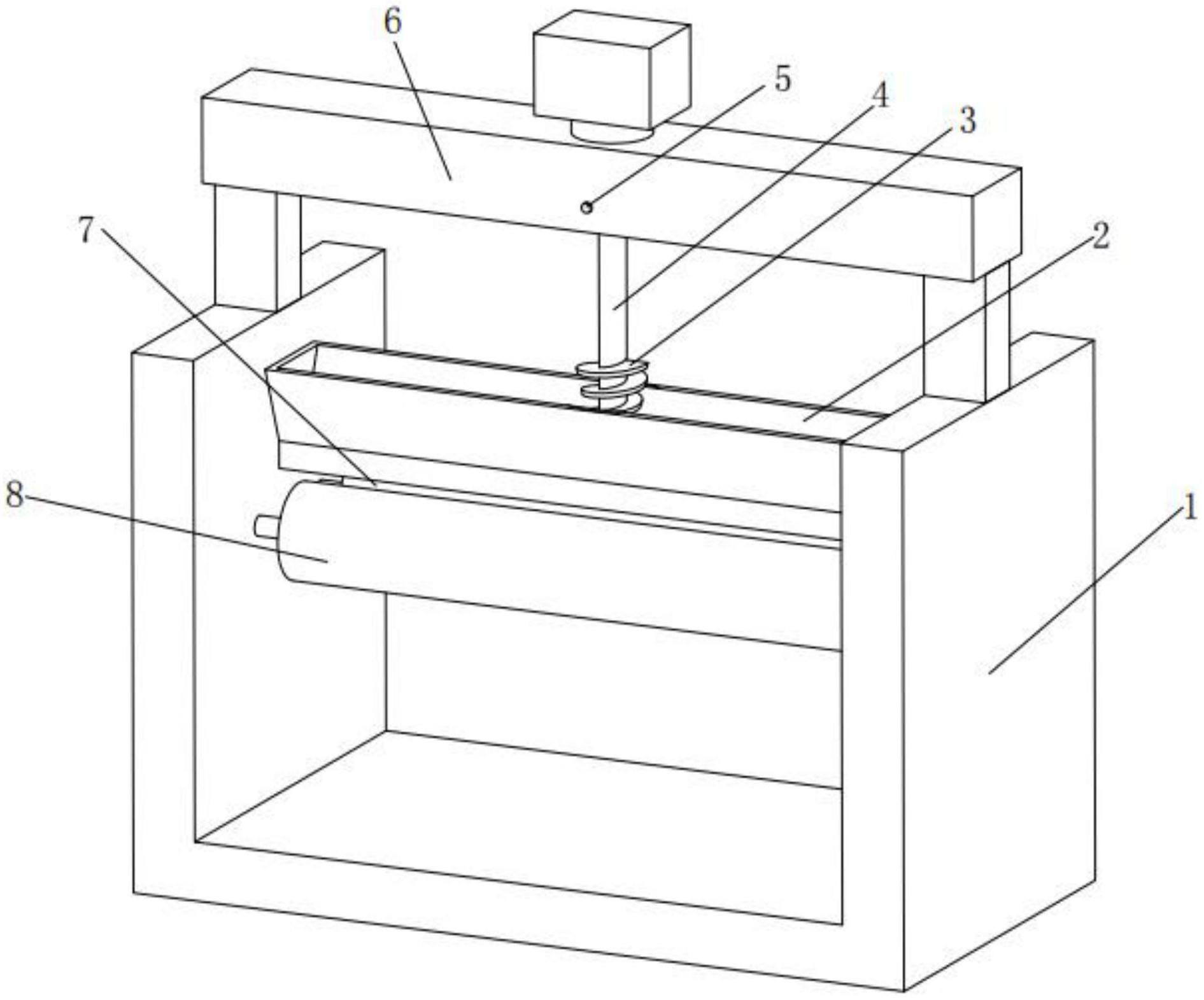 本实用新型公开了一种PVC片材用双辊开炼机。其技术方案要点是:一种PVC片材用双辊开炼机,包括机架,机架上活动设置有前辊和与前辊相对设置的后辊,机架上设置有投料箱,投料箱位于前辊和后辊的上方,机架上固定连接有支撑架,支撑架上设置有至少一个搅拌件,搅拌件包括搅拌杆和与搅拌杆固定连接的搅拌叶片,支撑架上设置有用于驱动搅拌杆的电机,电机与支撑架固定连接。本实用新型通过搅拌件对投料箱内的胶料进行搅拌,避免胶料产生囤积导致下料困难,提升了整体的生产效率。