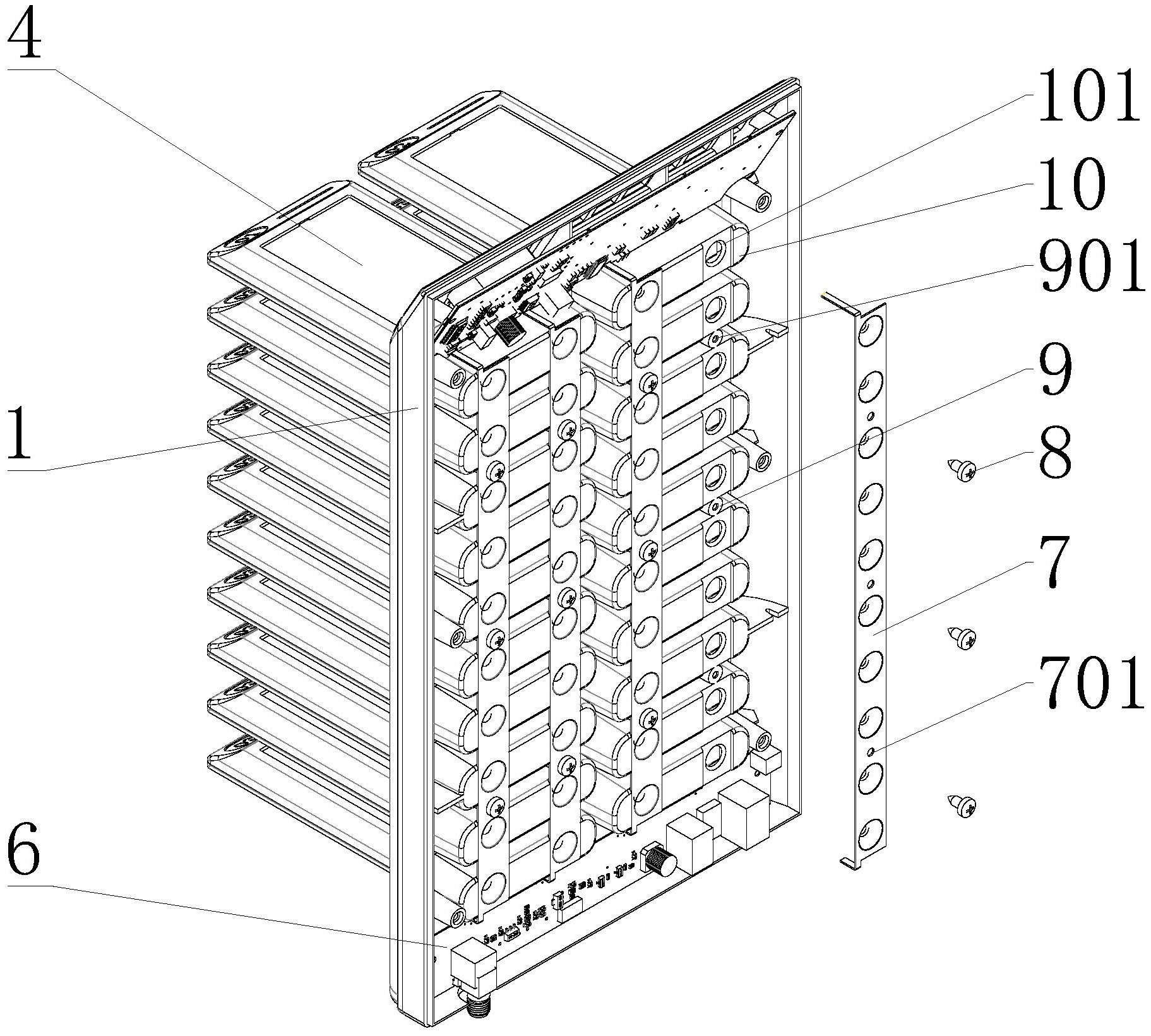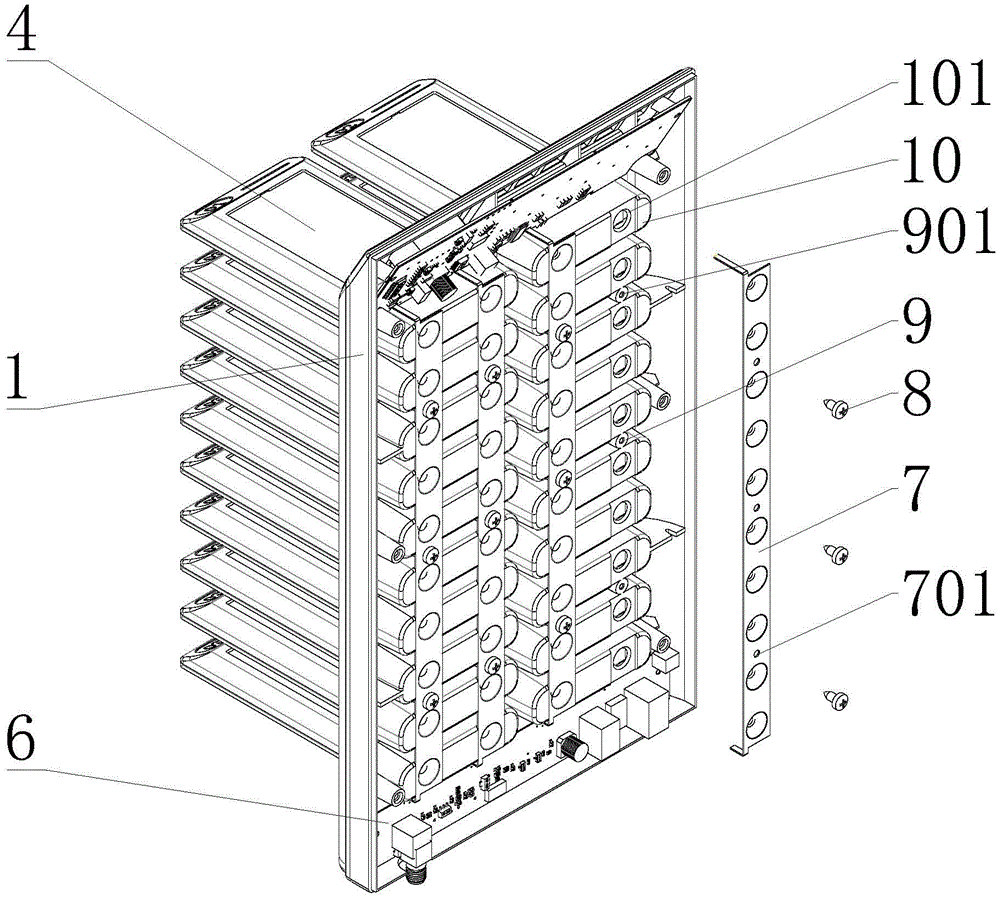 一种无线取餐器餐牌充电底座装置,包括底座外壳、操作板、餐牌、电路板、充电片、螺栓和安装块;底座外壳侧端面连接操作板;操作板上设有操作按键和显示器;两组电路板分别连接底座外壳的内壁;两组安装块均连接底座外壳的内壁,每个安装块与底座外壳连接的一端均设有凹槽;凹槽贯穿安装块,凹槽的底面在安装块上设有两个装配孔;餐牌的一端配合插入凹槽内;多组充电片的两端均分别连接两组电路板,每组充电片上均均匀设有多组凸起;多组凸起配合插入多组装配孔内;多组充电片通过螺栓连接底座外壳;操作按键、显示器、电路板和充电片电性连接。本实用新型充防水效果好,成本低、美观、低碳环保且生产效率高。