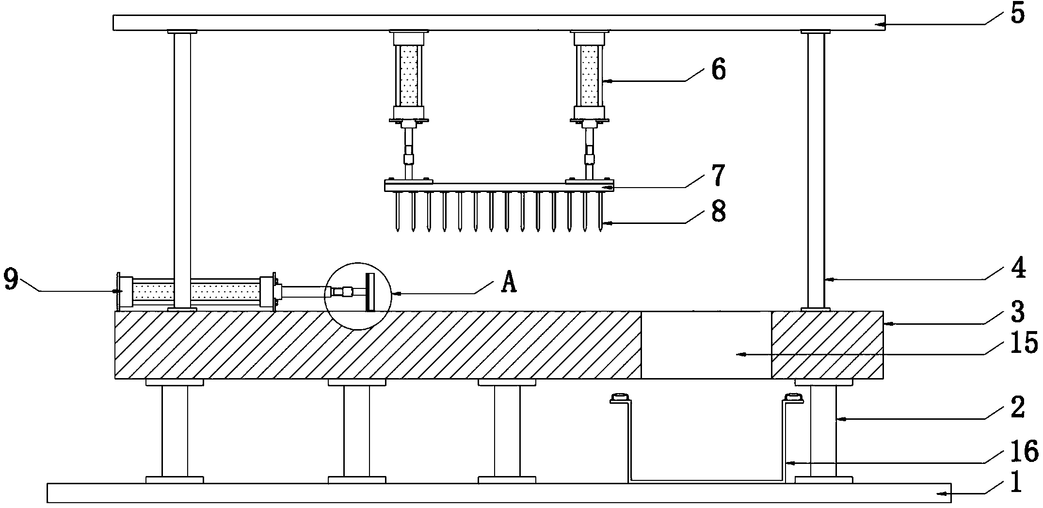 本实用新型涉及魔芋素食加工技术领域,具体的说是一种魔芋素食加工用切条装置,包括底座,所述底座的顶部通过第一支撑柱连接有水平设置的加工平台,所述加工平台的顶部通过第二支撑柱连接有水平设置的机架,所述机架的底部对称安装两组液压缸,所述板体的一侧开设有凹槽,所述板体内部底部开设有预装有弹簧的深槽,所述深槽纵向开设,且深槽中插接有竖直设置的刮板,所述刮板的顶端抵靠到弹簧,所述刮板的底端覆盖有橡胶条,所述通孔正下方的底座上放置有收集框。切割完成后刀板本体复位,利用推料板组件将切割好的产品推至通孔中,物料在自身重力作用下落在了收集框中,下料操作简单。