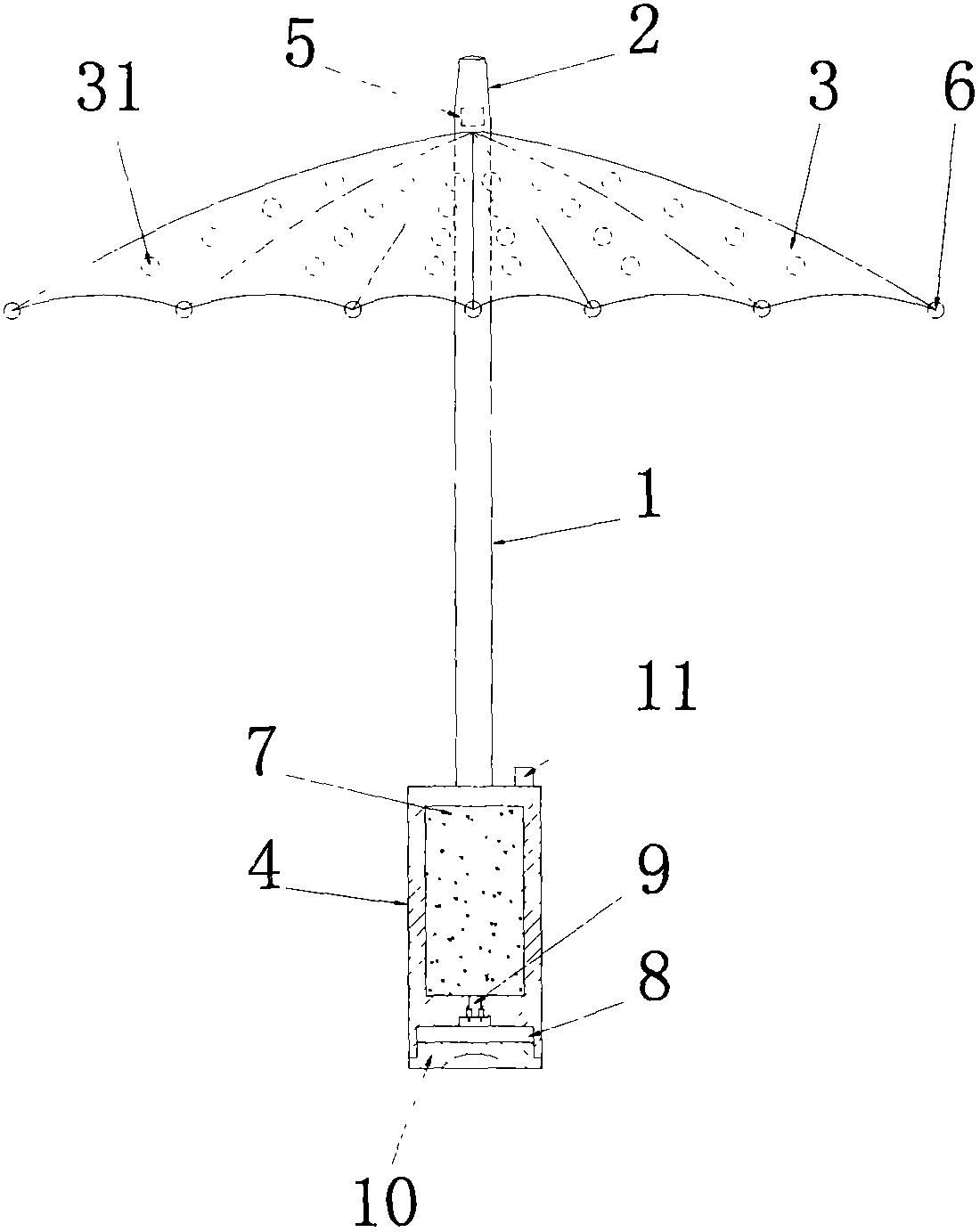 本实用新型公开了一种雨水敲打就开放音乐的伞具,包括伞杆,所述伞杆的顶端套设有伞面,伞杆的顶端固定连接有与伞面相配合的伞头,所述伞头内嵌设有音乐播放器,所述伞面上均匀的嵌设有若干压敏开关,所述压敏开关连接音乐播放器,所述伞杆的底端固定连接伞把手,伞把手是圆柱体结构,伞把手的轴线与伞杆的轴线重合,伞把手内嵌设有蓄电池,所述蓄电池电性连接音乐播放器;本实用新型使用时,雨水落在伞面上,雨滴打压在压敏开关上,即可通过压敏开关打开音乐播放器,从而播放音乐,进而大幅提升整个装置的趣味性,便于吸引儿童,有助于整个装置在儿童人群中推广使用。