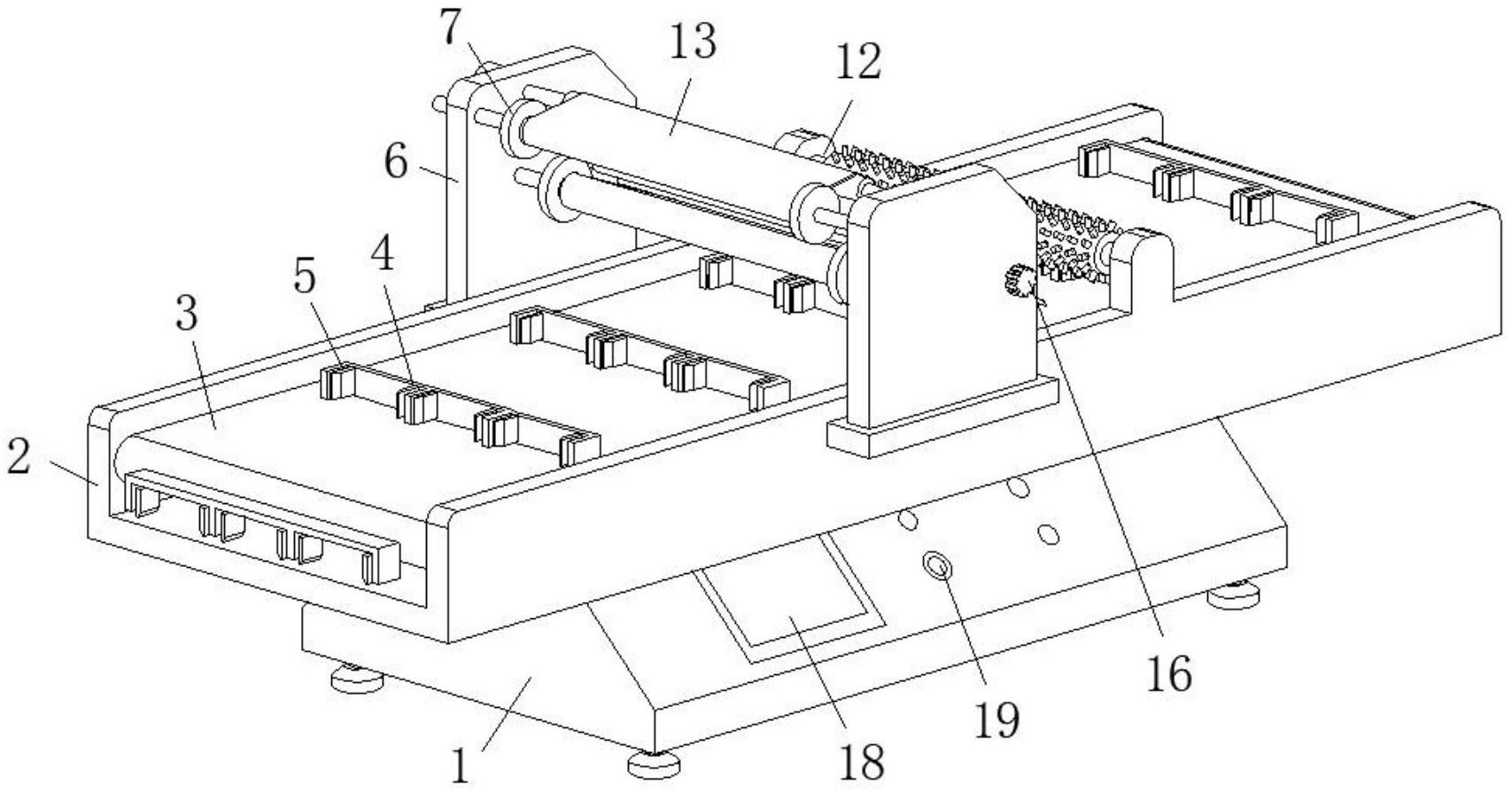 本实用新型公开了一种酱油包装用多瓶同步贴标装置,包括底座,所述底座的顶部固定安装有U形架,所述U形架之间固定安装有输送带,所述输送带上固定安装有若干个间隔设置的限位板,每个所述限位板的侧壁上均固定安装有夹紧件;所述U形架的两侧壁上固定安装有对称设置的支架,两个所述支架之间通过轴承转动安装有放卷辊、输送辊、张紧辊和收卷辊,且两个支架之间安装有角度可调的剥离板;所述U形架的顶部固定安装有压标件。本实用新型可将多个瓶体并排放置在输送带上,达到了多瓶同步贴标的目的,提高了贴标效率,还能够满足不同尺寸包装瓶的使用需求,扩大了适应范围,具有结构精简以及成品质量高等优点。
