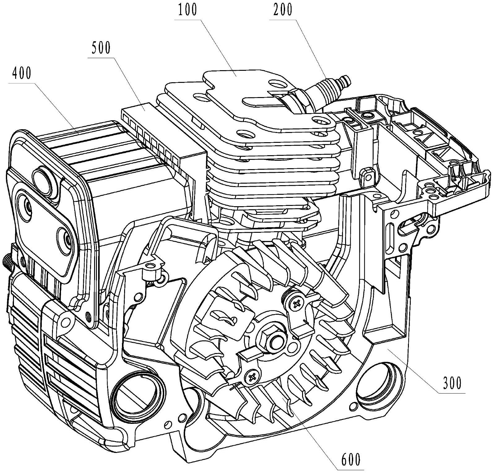 本实用新型提供一种发动机、油锯及割草机,涉及园林绿化领域的油锯、割草机等所使用的一系列小型发动机。发动机包括汽缸、消音器和隔板;汽缸具有排气口,消音器具有进气口,隔板设于汽缸与消音器之间,包括弹性密封区和辐射吸收区;弹性密封区设有排气通道,排气通道的一端与排气口连通,另一端与进气口连通;辐射吸收区环绕弹性密封区设置,设有散热件。隔板既能吸收来自于消音器的热辐射,阻断热辐射传递,又能够通过散热件迅速将热量以热传导的形式传递至环境中的空气。因而能够有效阻止消音器的热辐射对汽缸的影响,使传递至汽缸的热量有效减少,能够避免汽缸温度上升导致的缸壁润滑效果下降,进而避免活塞拉缸,提高发动机的使用寿命。