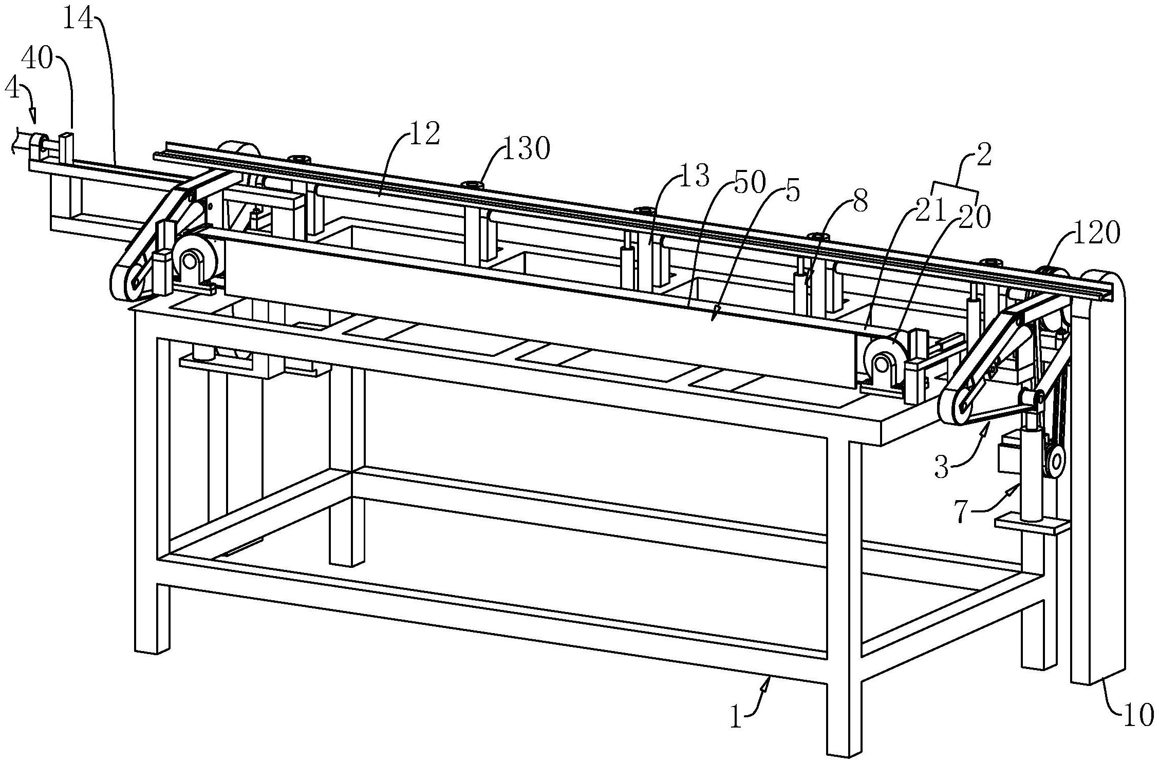 本申请涉及一种生产线龙骨传送机构,包括水平设置的机架,在所述机架上设置有用于带动龙骨沿机架长度方向运动的水平传送件,在所述机架的两端设置有用于带动龙骨沿机架宽度方向抬升的抬升传送件,在机架上位于水平传送件的上游设置有用于推动龙骨沿机架长度方向运动的推动件。本申请具有提高对龙骨传送的稳定性,同时提高龙骨与冲压机对应的精准度的优点。
