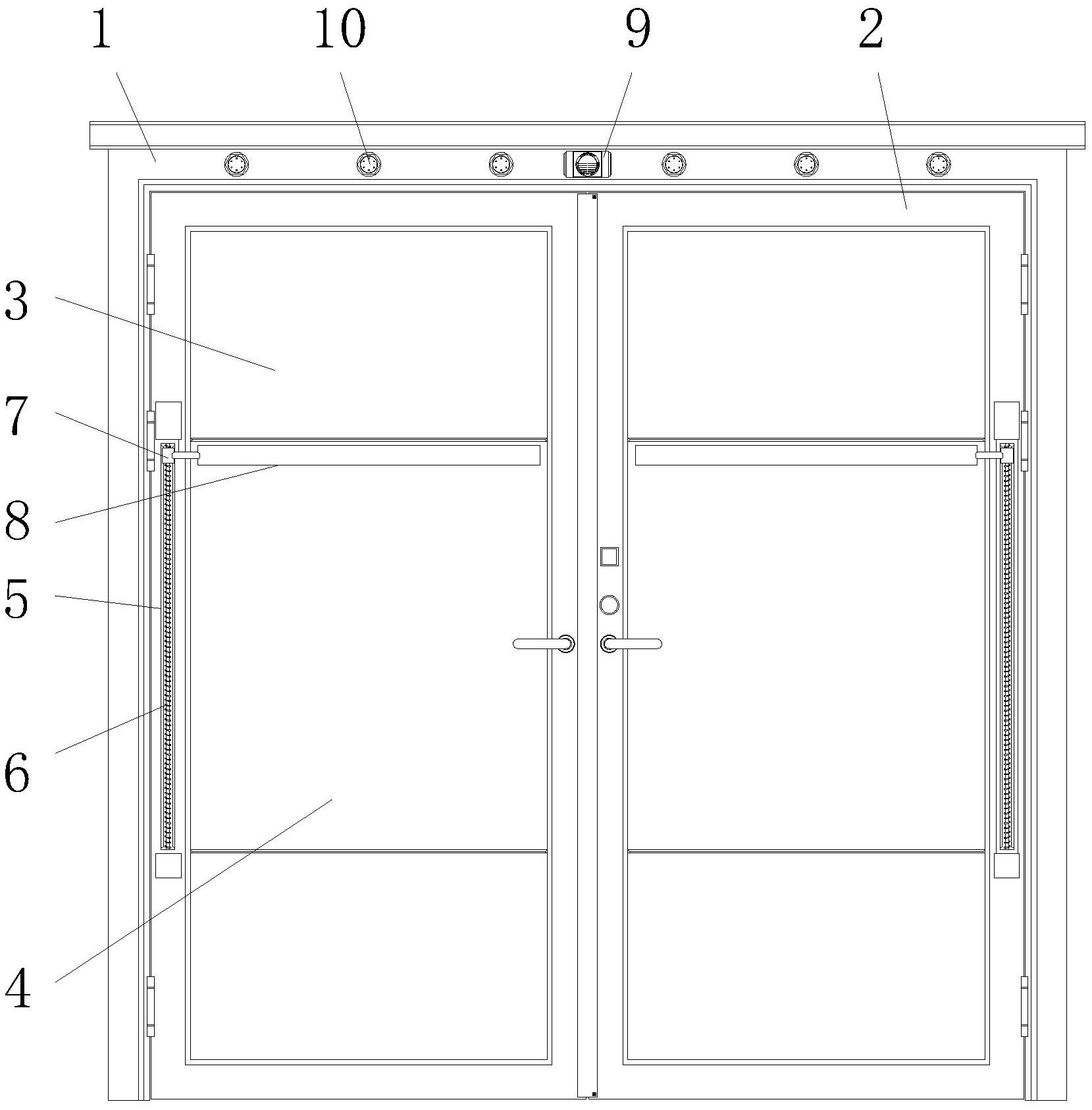 本实用新型公开了一种具有隔音功能的医用双包套玻璃防火门,包括双包门套、安装框、烟雾感应器和滑板,所述双包门套的内侧转动安装有金属门框,所述安装框焊接在金属门框的外侧面,且安装框的内部转动连接有定位丝杆,所述烟雾感应器固定安装在双包门套的上端中间位置,所述金属门框的侧面安装有侧边板,所述密封条通过密封槽与金属门框相互连接,所述横板的侧面固定安装有纤维棉板,所述滑板对称安装在侧边板的内部两侧,所述定位丝杆的下端外侧面焊接有传动齿轮。该具有隔音功能的医用双包套玻璃防火门,采用新型的结构设计,使得本装置安装使用的隔音效果较好,且该装置设置有烟雾处理结构,提高出现火灾时夹胶玻璃的可视效果。