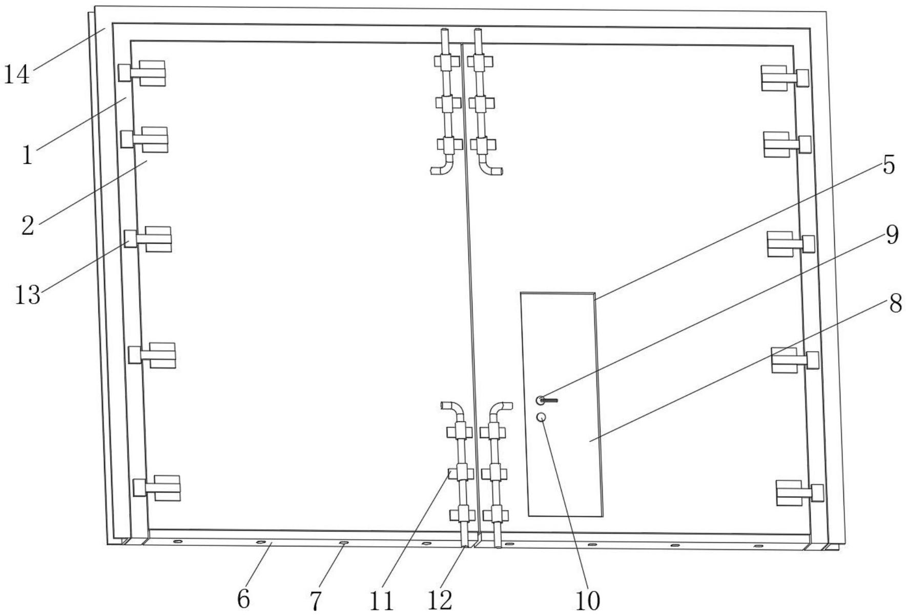 本实用新型公开了一种大型保温隔音门,本大型保温隔音门通过在门框内部经门扇合页配合铰接安装两个门扇,可极大程度的提升本大型保温隔音门的防护面积,且通过在门扇的侧面开设门槽和通行门,可降低门扇的开合率,提升本大型保温隔音门的安全防护及保温效果,通过为网格状镀锌板制成的支撑骨架可提升门扇的稳固性,且通过将支撑骨架的网格直径由外至内逐渐减小,可在保证门扇稳固性的同时降低材料的损耗,通过在支撑骨架内部填充隔音板可极大程度的提升本大型保温隔音门的隔音效果,通过在门扇的下表面经螺钉固定安装隔音条,可对门扇与地面之间的间隙进行封闭,由此可使本大型保温隔音门的保温性及隔音效果均得到提升。