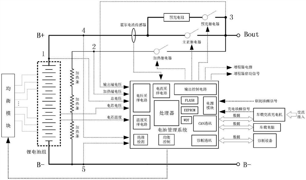 本实用新型涉及电池技术领域,尤指一种带增程器的低速车锂电池系统,包含:电池管理系统、锂电池组、霍尔电流传感器、主正继电器、预充继电器、增程器电源、均衡模块、热管理模块以及端口(Bout、B+和B‑),所述电池管理系统与所述锂电池组、霍尔电流传感器、主正继电器、预充继电器、增程器电源、均衡模块以及热管理模块连接,所述锂电池组经霍尔电流传感器、主正继电器与端口Bout连接,所述均衡模块与锂电池组连接。本实用新型能对电池充放电进行监控,而且能扩大低速车的地域使用范围、方便用户充电。