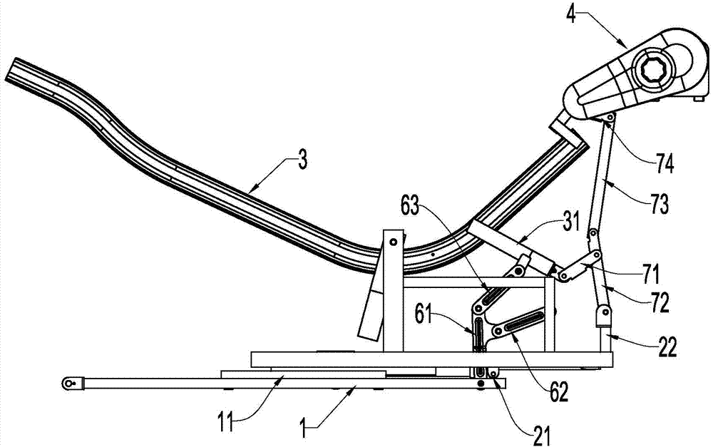 本实用新型涉及一种由前滑带动零重力的按摩椅架,包括有底架、滑动座架、座靠架、小腿架和电动推杆;滑动座架安装在底架的轨道上,座靠架通过转轴安装在滑动座架上,小腿架铰接在座靠架前端;电动推杆两端分别枢设于底架和滑动座架上,驱动滑动座架沿底架的轨道前后移动,其中还包括第一连杆机构和第二连杆机构;第一连杆机构由滑动座架前移时,牵引座靠架从坐姿往平躺角度调整;第二连杆机构实现由座靠架驱动小腿架抬举动作。本实用新型一种由前滑带动零重力的按摩椅架,其优点在于:仅使用一个电动推杆和两组简单的连杆机构,就能有效实现前滑、平躺、抬腿多个功能的连贯动作,结构简单、成本低廉,并且为用户放置按摩椅节约了空间,设计人性化。
